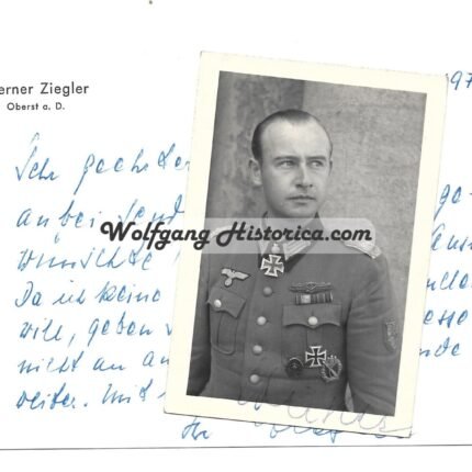 Hoffmann Photo Postcard (Nr. R100) of Knight’s Cross with Oakleaves and Swords Holder Otto von Knobelsdorff, who earned the Ritterkreuz on September 17, 1941 as Generalleutnant and Kommandeur of 19. Panzer-Division, the Eichenlaub on November 12, 1943 as General der Panzertruppe and Kommandierender General of the XXXXVIII. Panzerkorps and the Schwertern on September 21, 1944 as General der Panzertruppe and Kommandierender General of the XXXX. Panzerkorps. Otto von Knobelsdorff passed away on October 21, 1966. Good condition. Postcardsize.