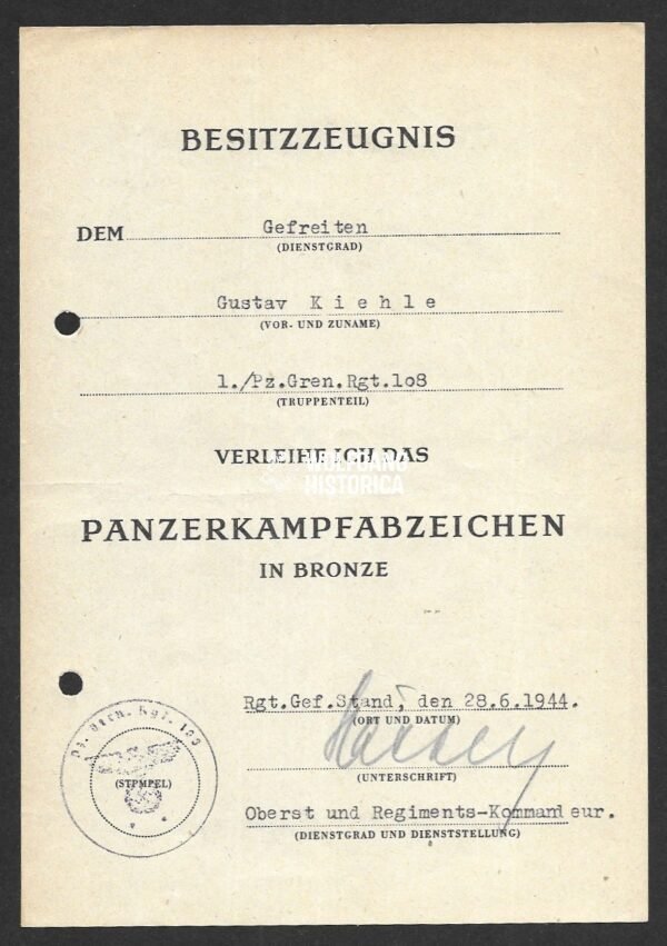 Award document of Gefreiter Kiehle, who served with the 1. Kompanie/ Panzergrenadier-Regiment 108 of the 14. Panzer-Division, for the Panzerkampfabzeichen in Bronze (Panzer Assault Badge in Bronze), awarded on June 28, 1944 for 3 (separate) armored assault days during his service! Condition as seen.
