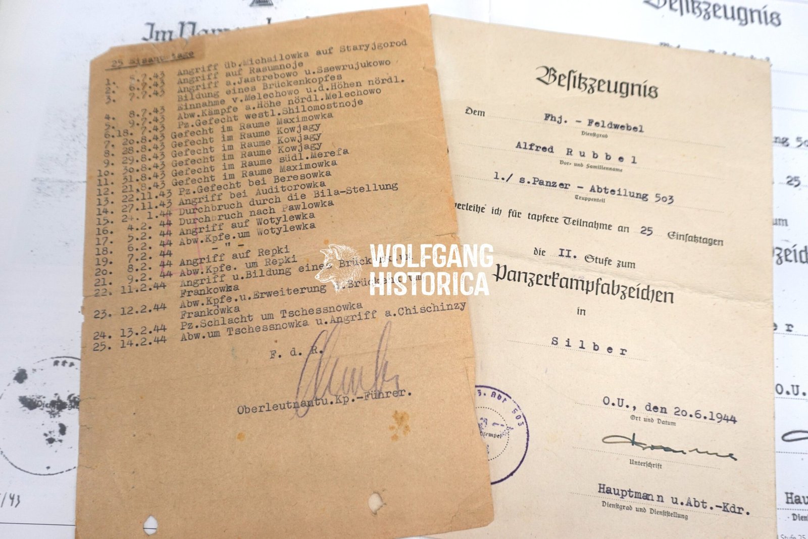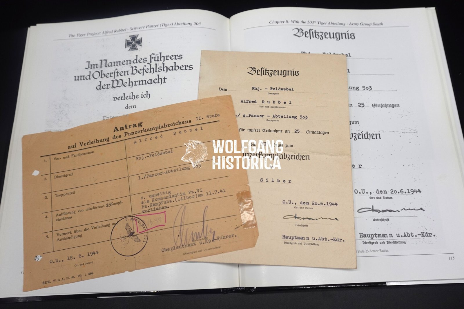 Panzerkampfabzeichen II. Stufe Award Doc: ALFRED RUBBEL (!) schwere Panzer-Abteilung 503 (Tiger, King Tiger!)