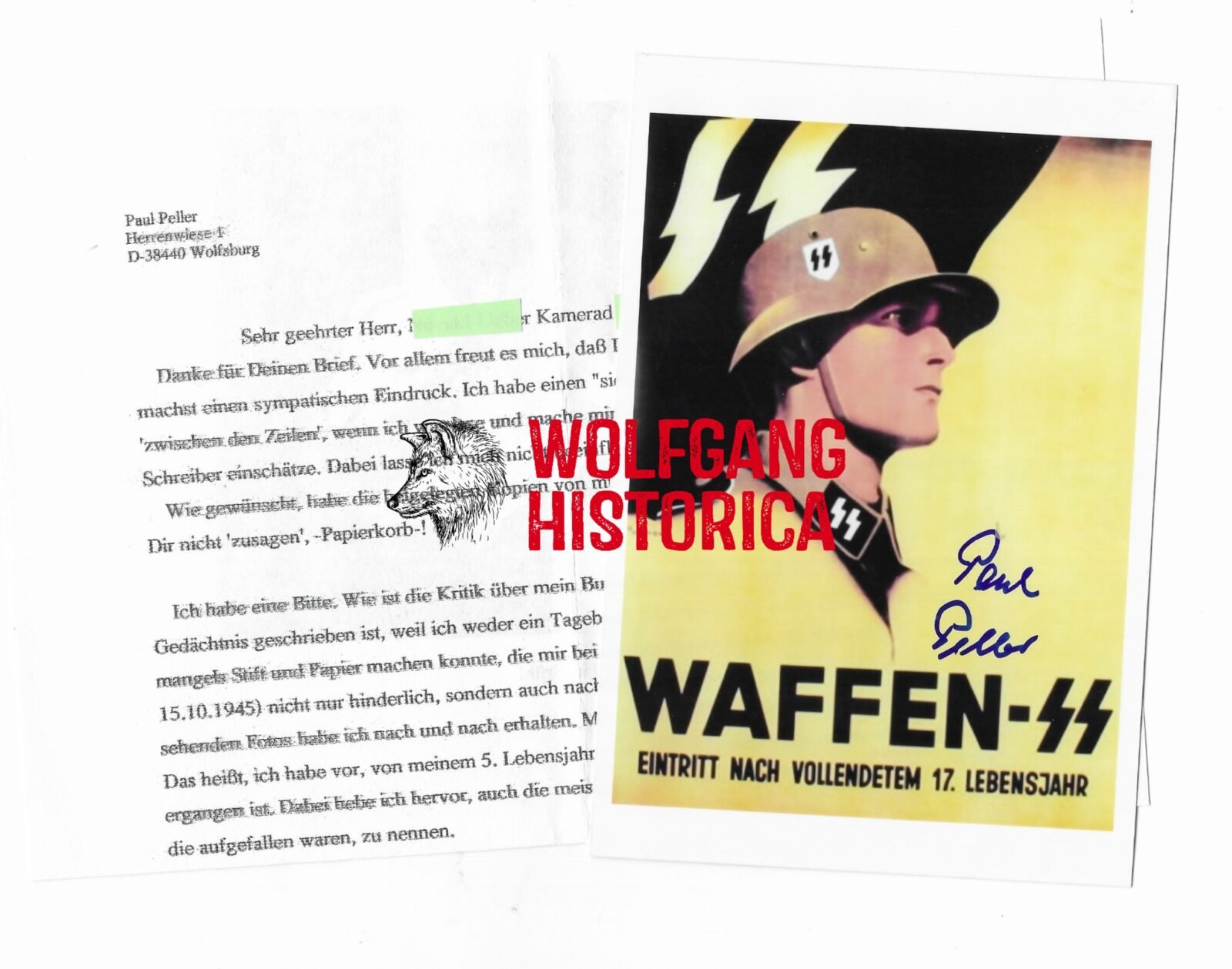 Original Postwar Signature on a Postwar Photo of Paul Peller. Paul Peller (00.00.1926 † ) served with the 10. SS-Panzer-Division “Frundsberg” & 18. SS-Freiwilligen-Panzergrenadier-Division “Horst Wessel”. Good condition. Postcardsizes.
