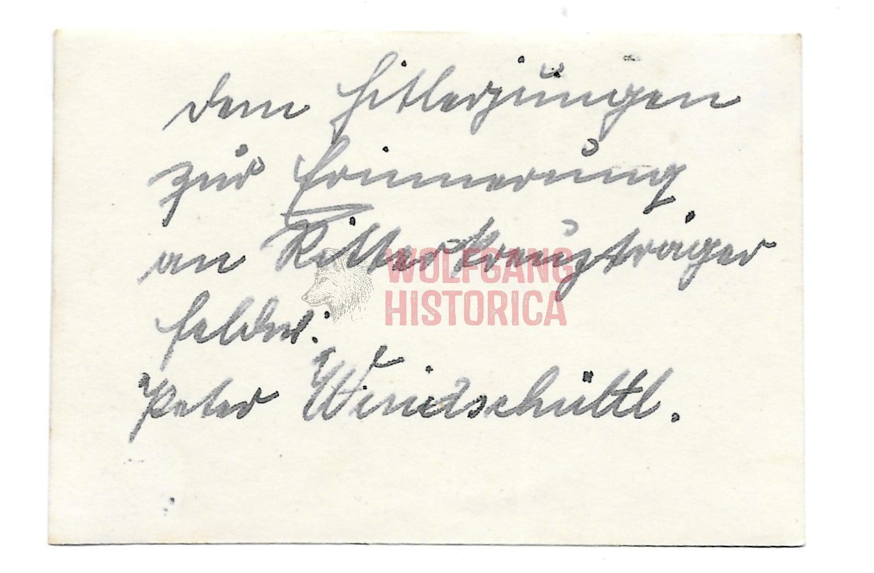 Wartime Signed Photograph of Feldwebel Peter Windschüttl (20.05.1918 † 21.01.1992) who earned the Ritterkreuz des Eisernen Kreuzes on July 22, 1943 as Unteroffizier u. Geschutzführer in the 14. Kompanie/ Grenadier-Regiment 72 of the 46. Infanterie-Division. Measuring: 8x6cm.