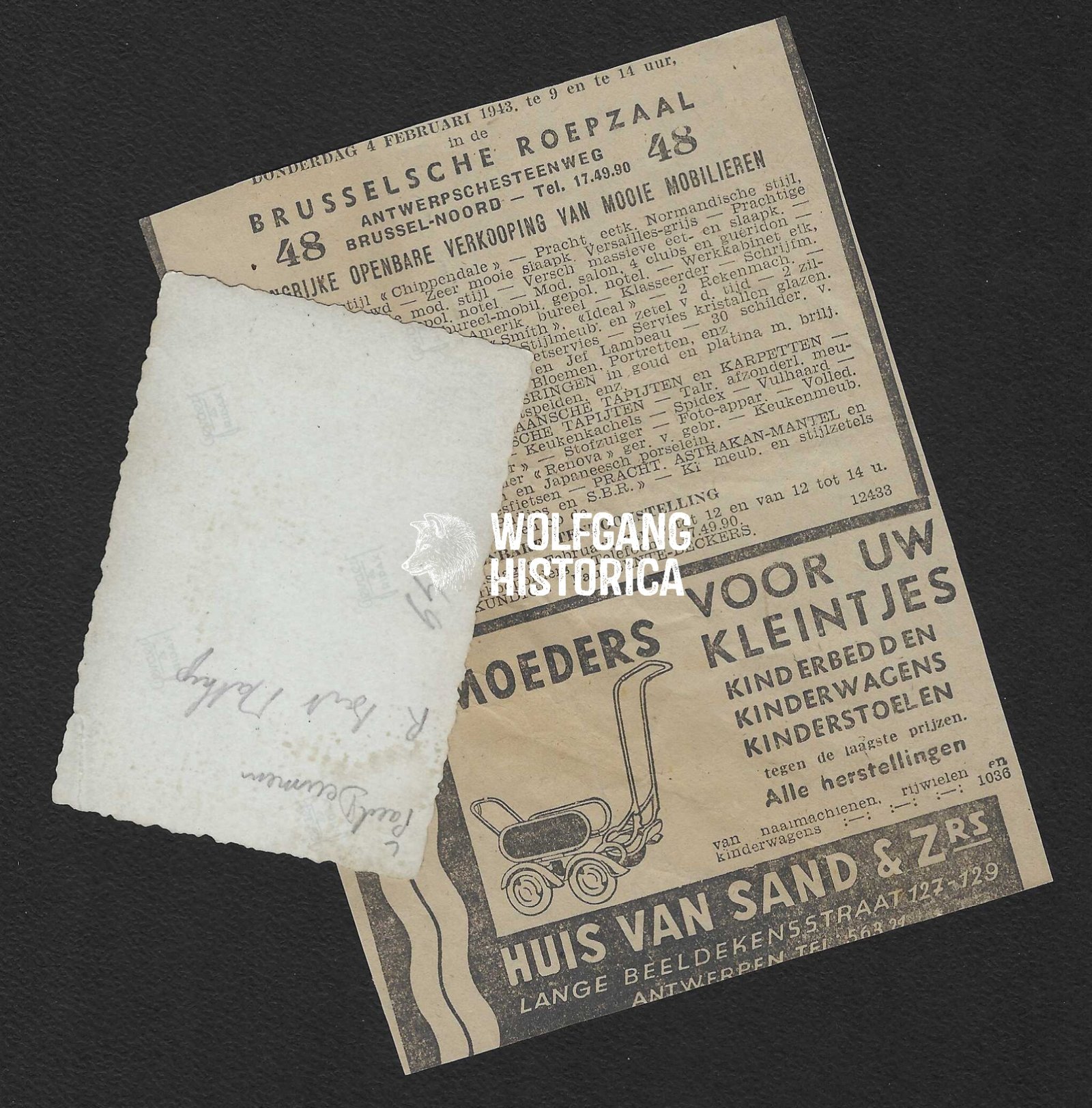 Original photograph and newspaper obituary of a fallen Flemish Waffen-SS Volunteer, Paul Deumens. Size: 6x9cm.