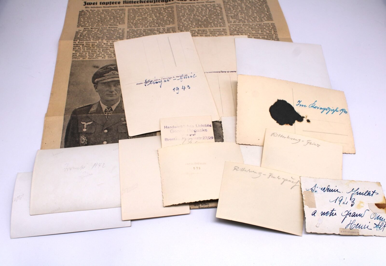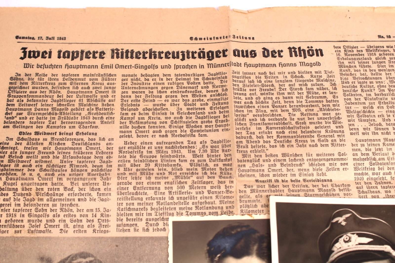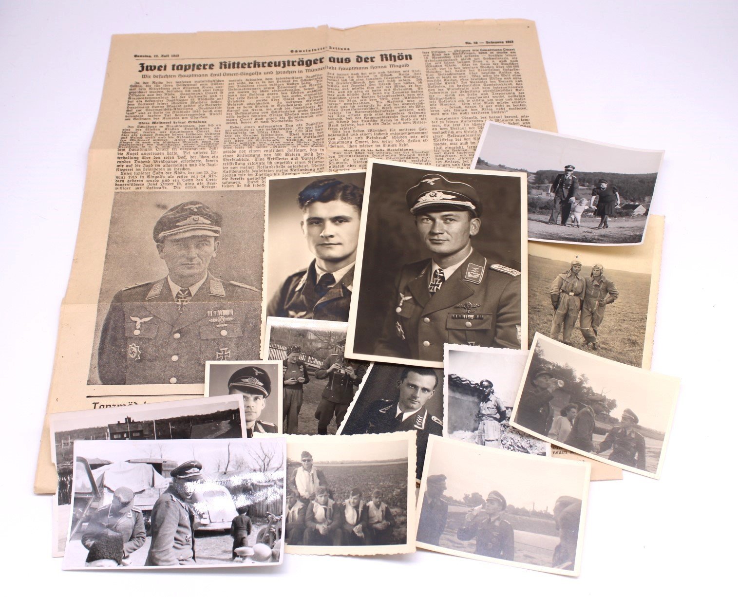 Set of 13x photographs of Emil Omert and a period article of a newspaper. Emil Omert was credited with 70 victories in over 700 missions, including 125 fighter-bomber and ground attack missions. He recorded 20 victories over the Western front, including four four-engine bombers.