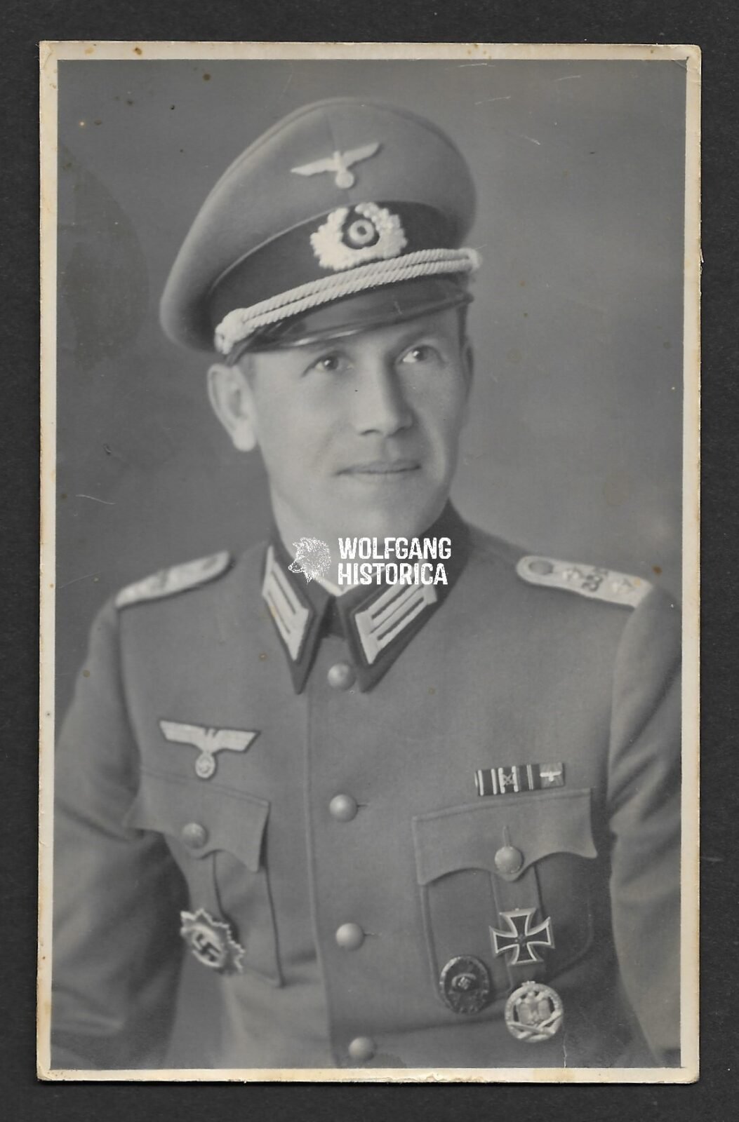 Original Wartime Portrait of a Wehrmacht (Heer) Hauptmann wearing the Deutsches Kreuz in Gold. Condition as seen. Postcardsize.