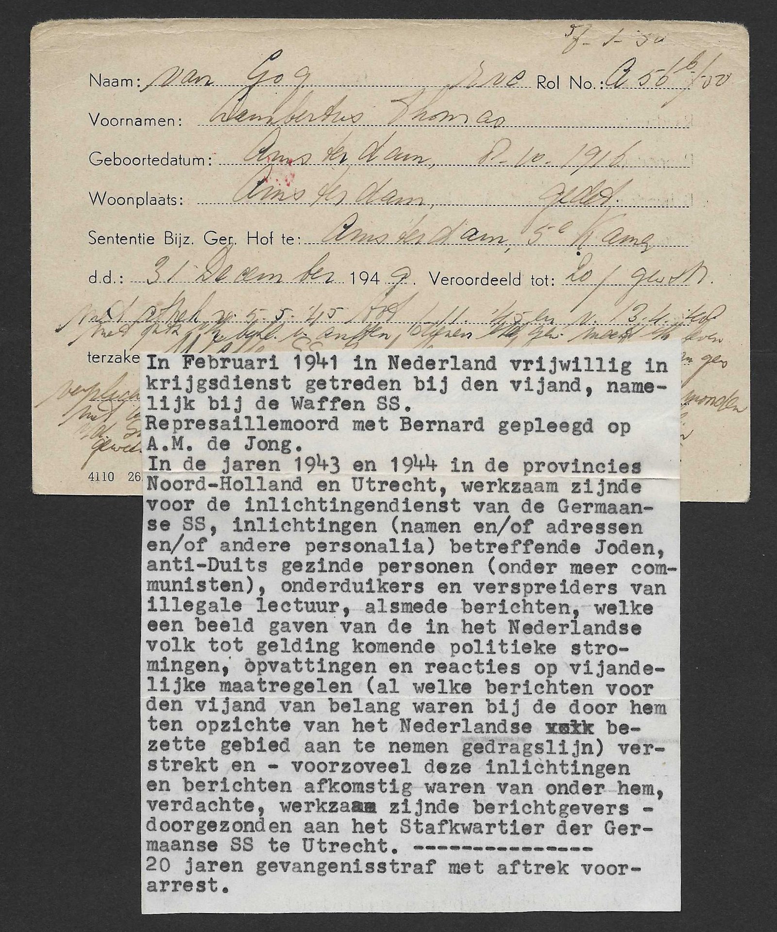 This authentic judicial card documents the prosecution and sentencing of Lambertus van Gog, who was tried by the Bijzonder Gerechtshof in Amsterdam following the Second World War.