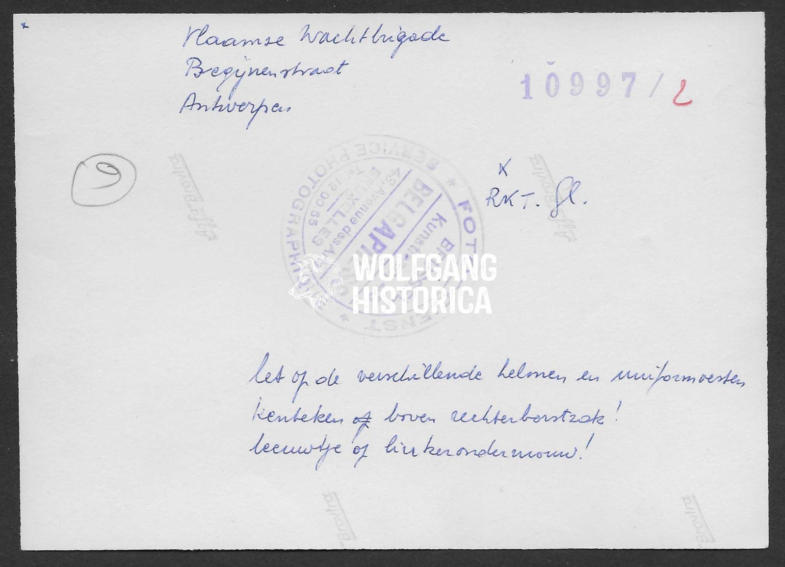 Original Flemish collaboration press photo of the Vlaamse Wacht, taken in the Begijnenstraat, Antwerpen. Condition as seen. Size: 13x18cm.