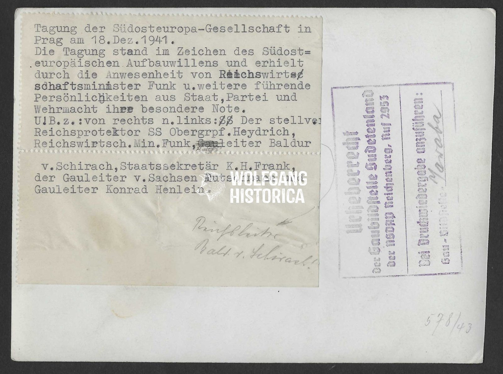 Authentic original wartime German press photograph of Reinhard Heydrich and many other TR personalities, issued by the Südosteuropa-Gesellschaft conference held in Prague on 18 December 1941, during the height of WWII. This is a period press photo (not a reproduction), distributed for wartime publication and documentation. Personalities seen: