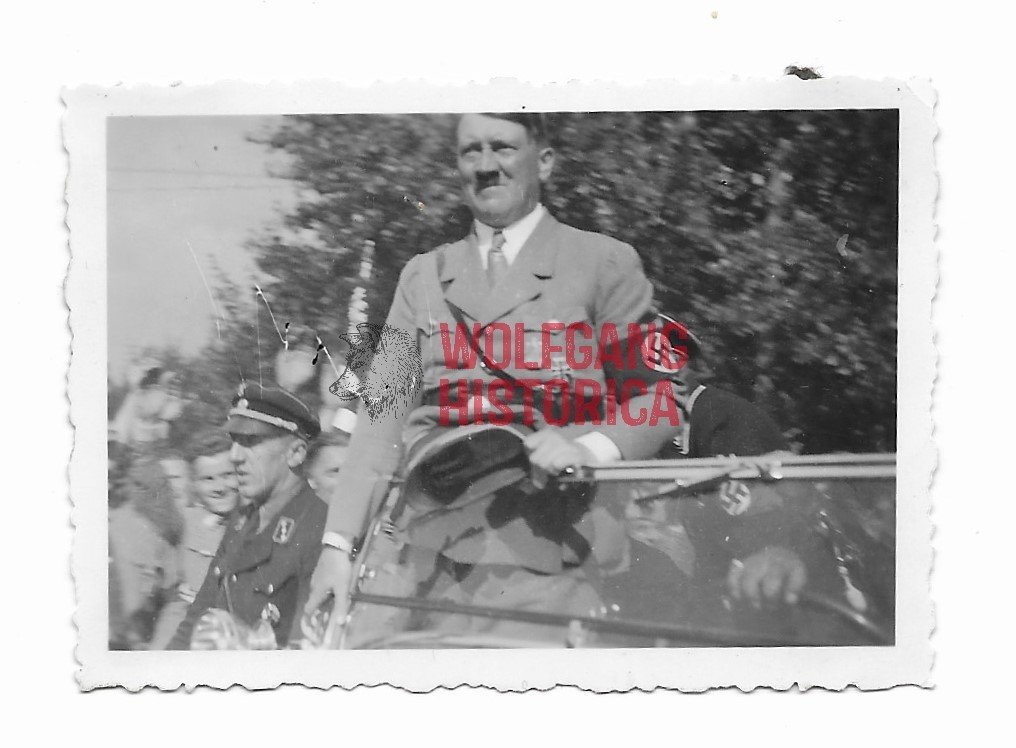 Original private photograph of Adolf Hitler taken while standing in a car surrounded by a crowd and SS guards. Size: 7,5×5,2cm.