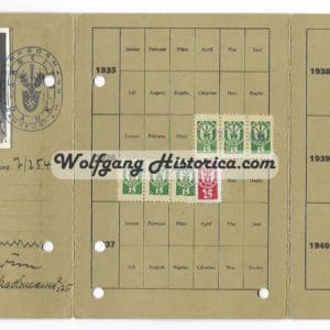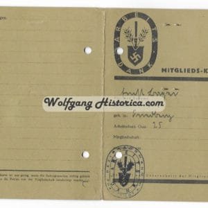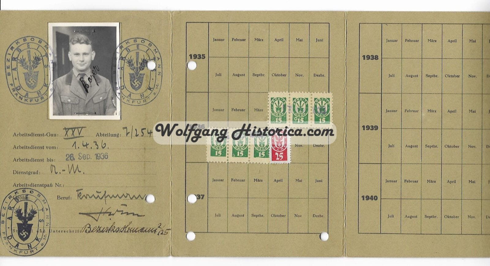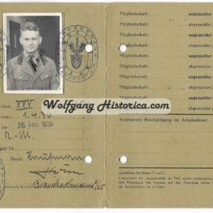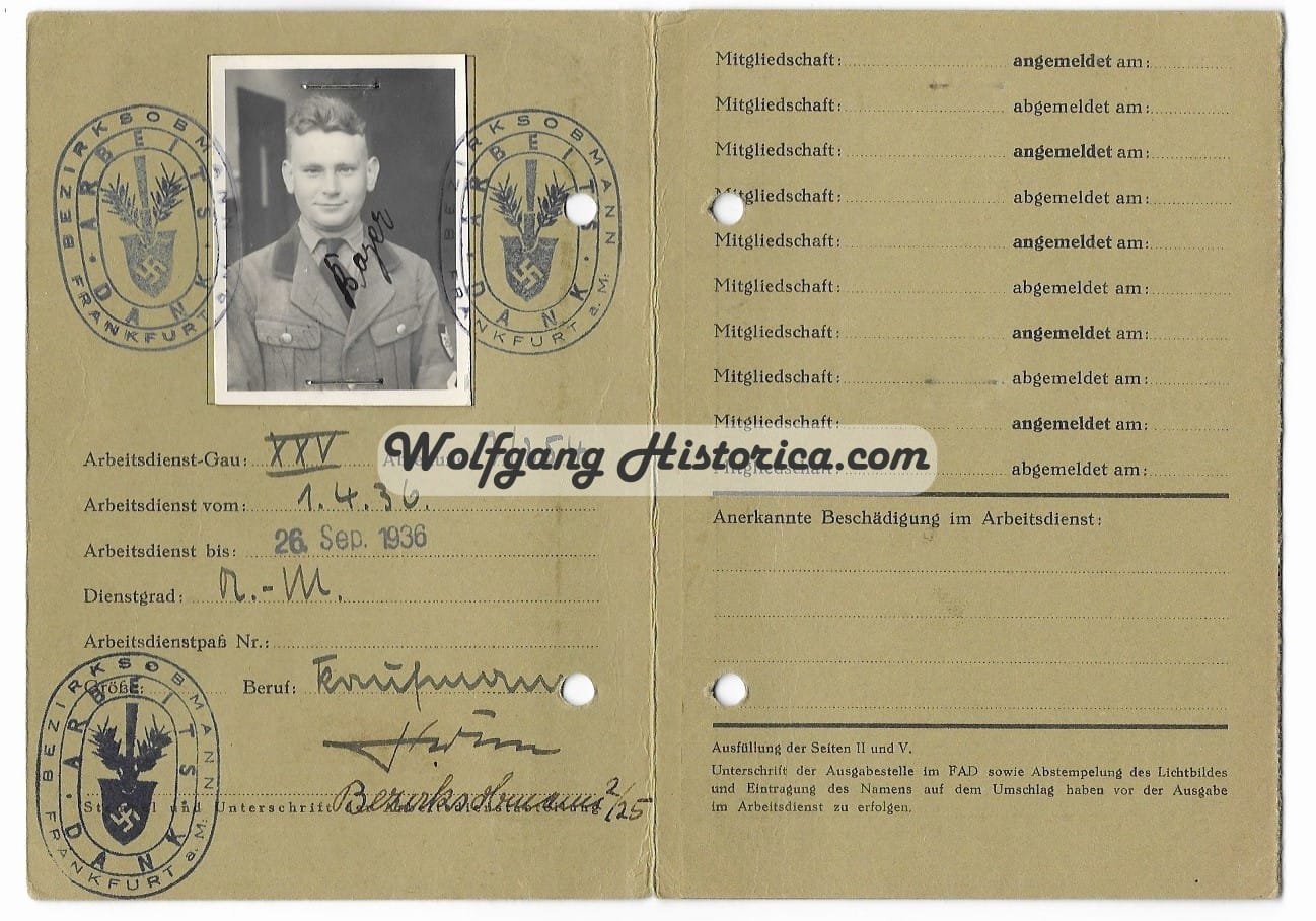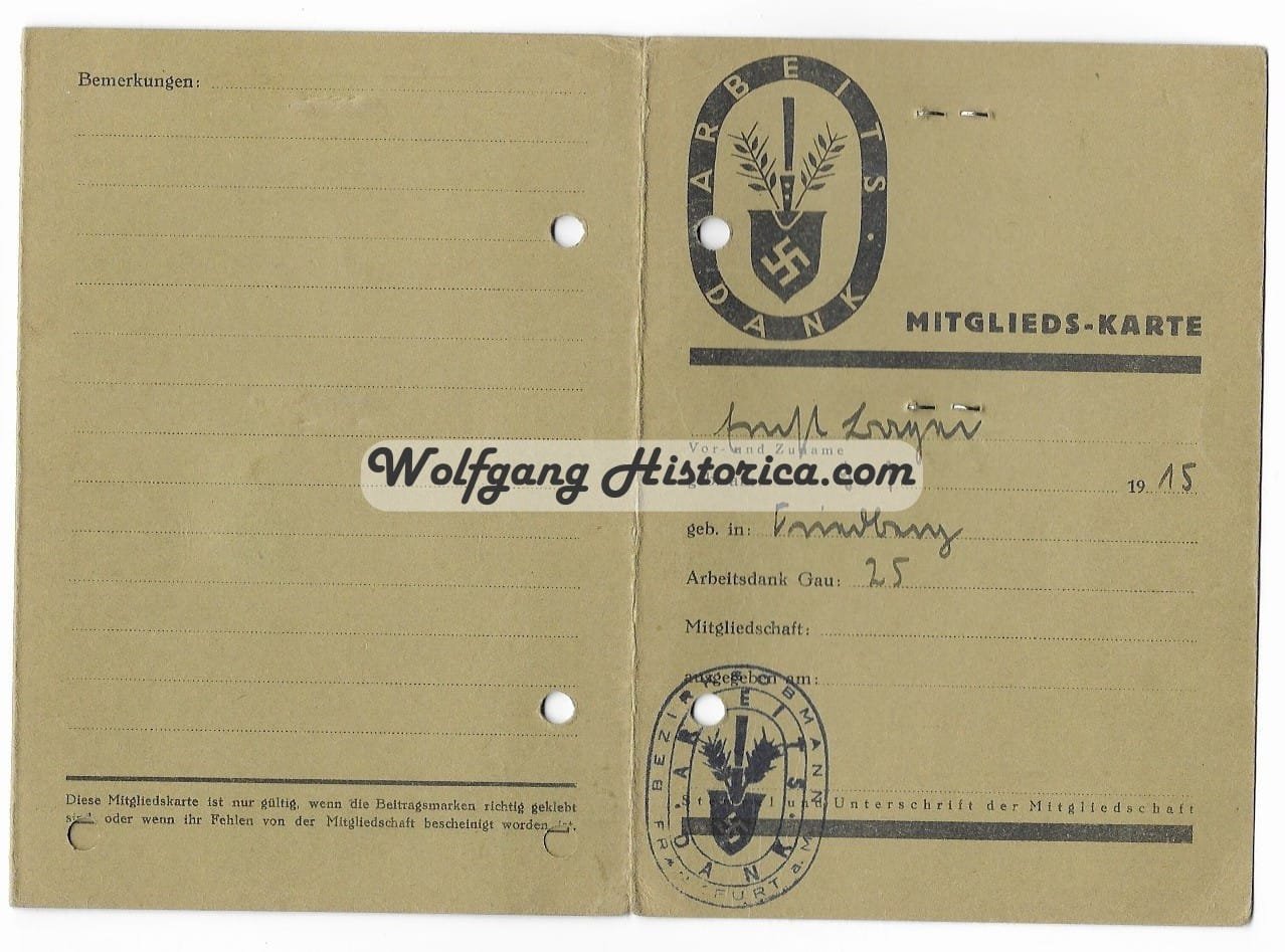 Reichsarbeidsdienst Arbeitsdank Mitglieds-Karte (ID) for a member of Gau 25, Abteilung 7/254 in Frankfurt a. Main. Stunning ID with photograph and both inkt & paper stamps.