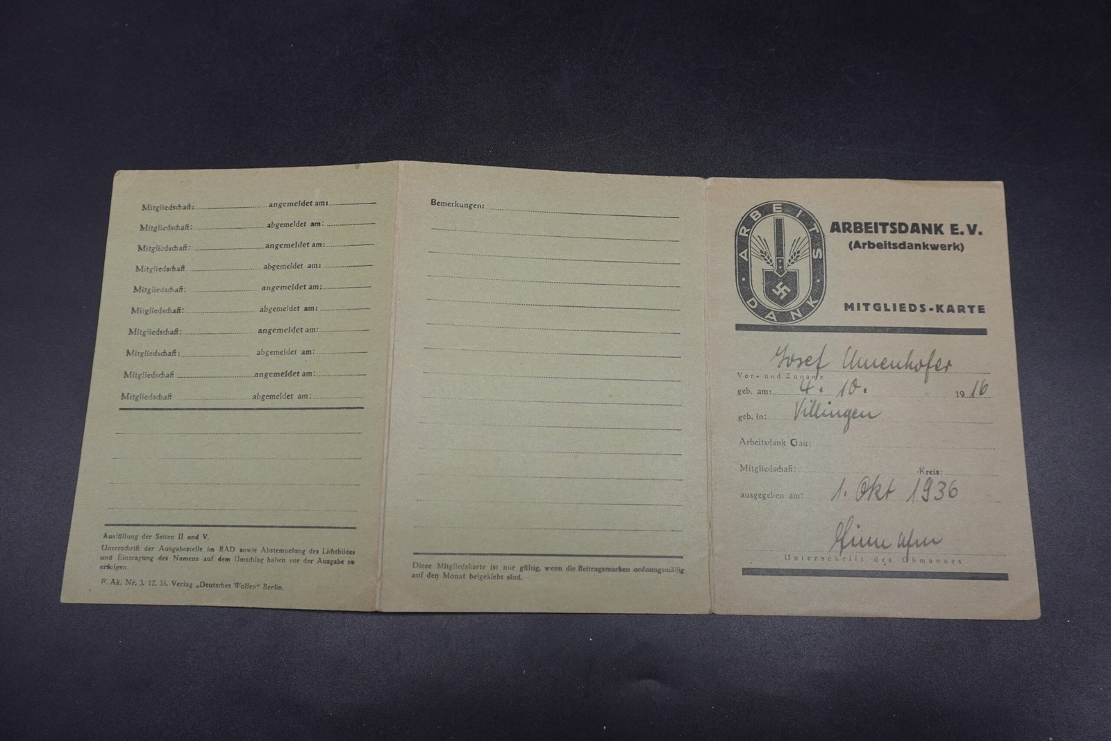 Original Reichsarbeidsdienst Arbeitsdank Mitglieds-Karte (ID) for a member of Gau XXVII, Abteilung 1/273. He was born in Villingen. Stunning ID with photograph and both inkt & paper stamps.