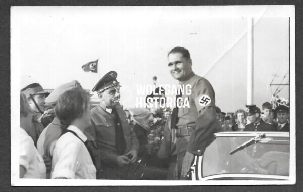 Original rare wartime photograph depicting Rudolf Hess standing in an open car during what appears to be a public gathering or rally. Several NSDAP officers and BDM girls are seen nearby, welcoming the official with flowers. A swastika flag is visible in the background along with crowds of onlookers. The image likely dates to the late 1930s or early 1940s, typical of propaganda-style event photography of the time.