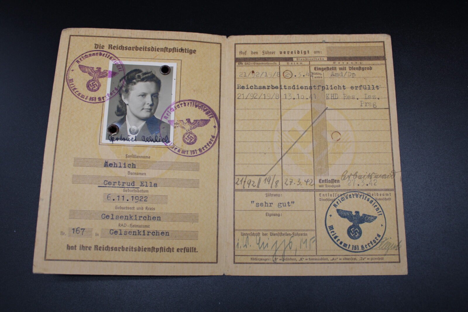 Original Reichsarbeitsdienst-Paß – Reichsarbeitsdienst für die weibliche Jugend, for a female born in Gelsenkirchen. She served from 3.41 to 3.42 with the RAD. She even performed Kriegshilfdienst with Reservelazarett-Prag! Complete with photo. Condition as seen.