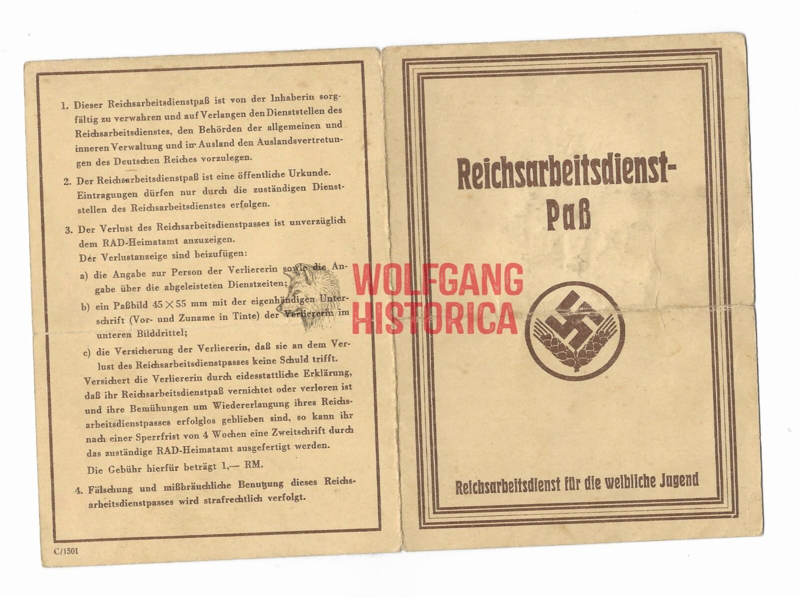 Reichsarbeitsdienst-Paß – Reichsarbeitsdienst für die weibliche Jugend, for a female born in Osterode, Allenstein. She served from 4.43 to 5.44 with the RAD including Kriegshilfsdienst. Good condition. Has been folded once.