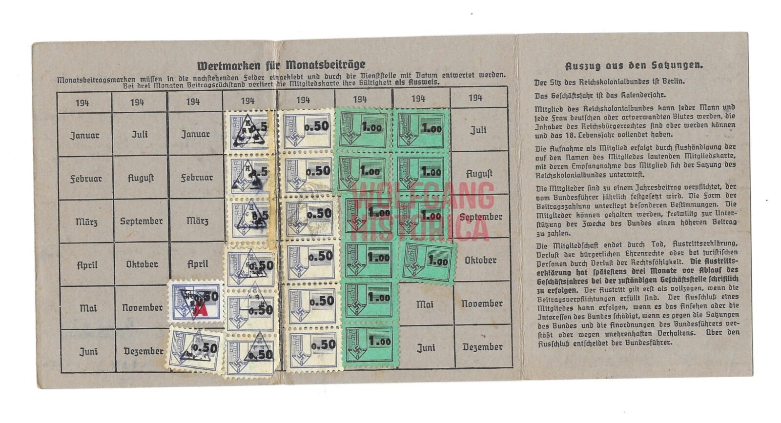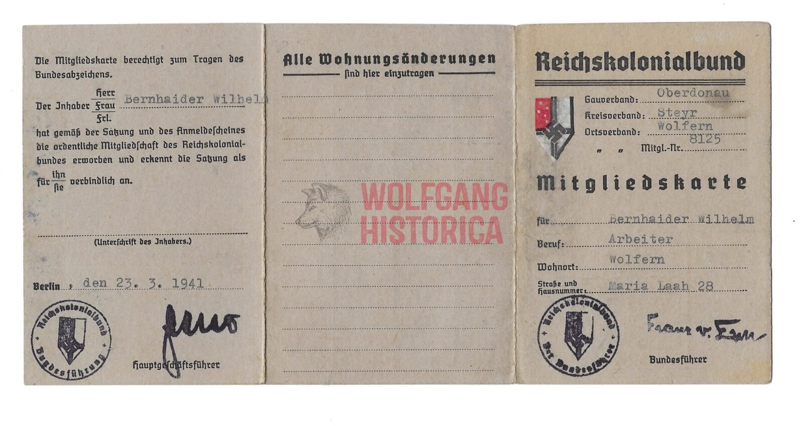 Reichskolonialbund Mitgliedskarte, opened in 1941. Good Condition.