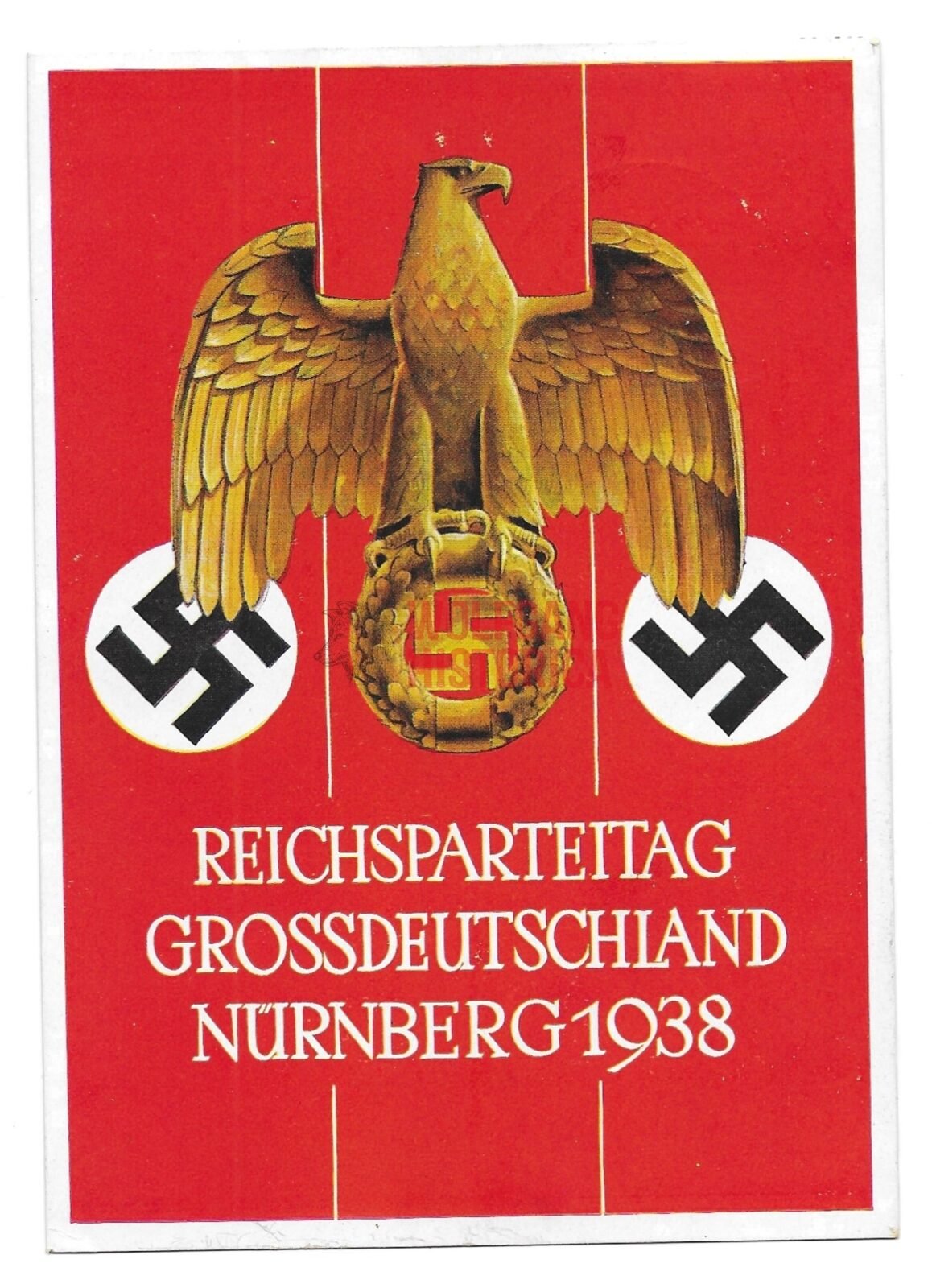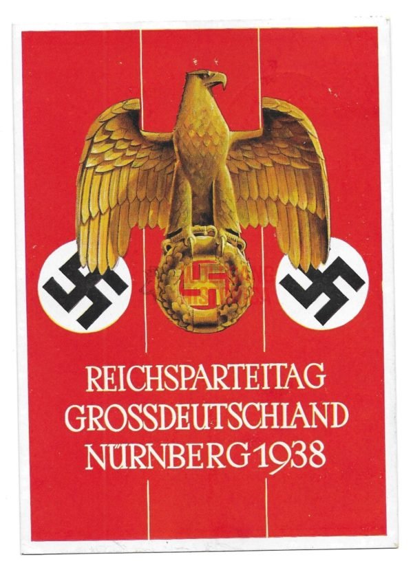 Postcard of the Reichsparteitag Nürnberg 1938 “Reichsparteitag Grossdeutschland”. On the reverse with stamps of the Reichsparteitag 1938! Good condition. Postcardsize.