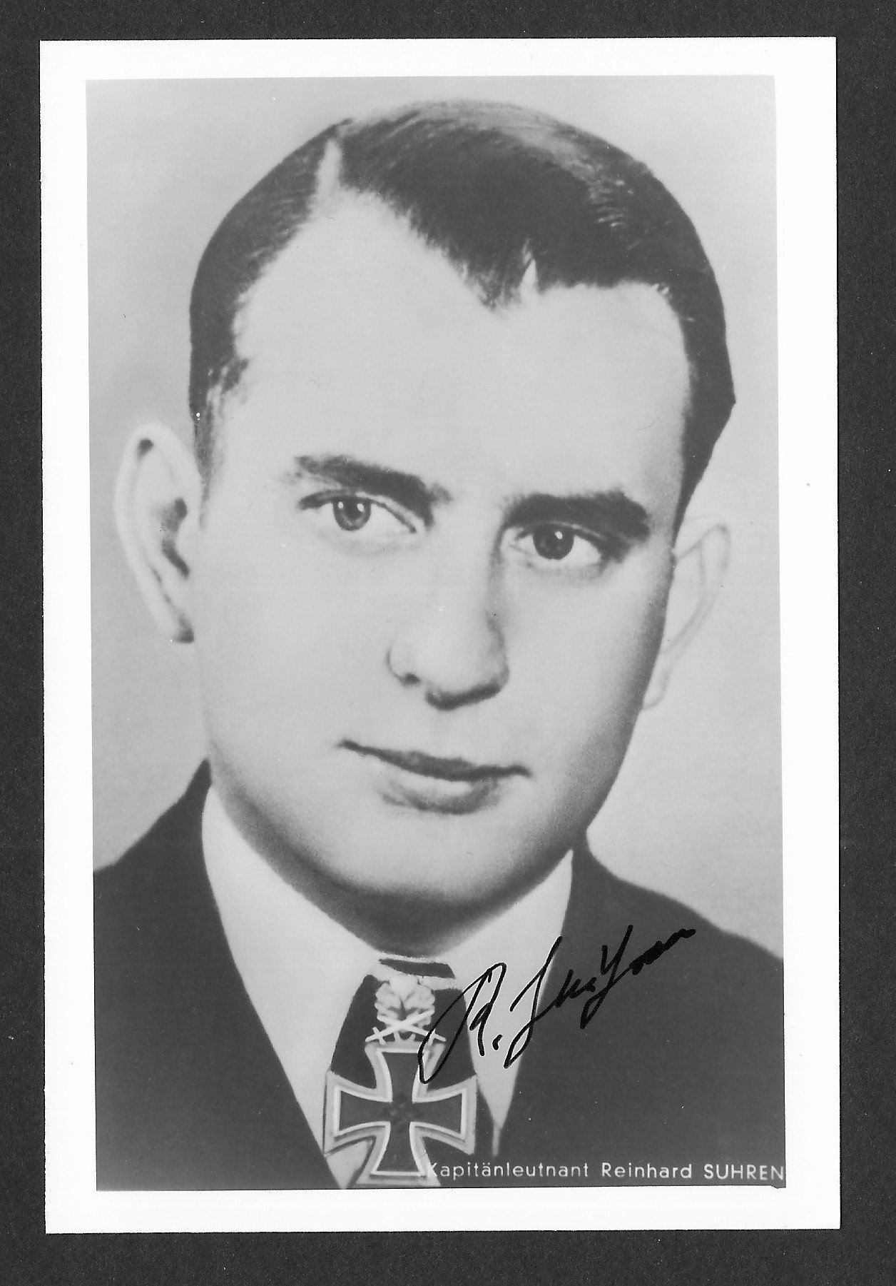Original Postwar Signature on a Postwar Photo of Reinhard Suhren. Fregattenkäpitan Reinhard Suhren (02.07.1914 † 26.12.2005) earned the Ritterkreuz des Eisernen Kreuzes on November 3, 1940 as Oberleutnant zur See und I. Wachtoffizier of Uboot “U-48”, the Eichenlaub on December 31, 1941 as Oberleutnant zur See und Kapitän of Uboot “U-564” and the Schwertern on August 17, 1942 as Kapitänleutnant und Kapitän of Uboot “U-564”.