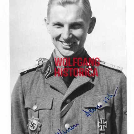Original Postwar Signature on a Postwar Photo of Richard Rudolf. SS-Oberscharführer Richard Rudolf (16.04.1923 † 13.12.2004) earned the Ritterkreuz on November 8, 1944 as SS-Oberscharführer und Zugführer in the 9. Kompanie/ SS-Panzer-Regiment 12 of the 12. SS-Panzer-Division “Hitlerjugend”. He was awarded the Knight’s Cross for his bravery in the Battle of Normandy fighting at the Carpiquet airfield just outside of Caen. Good condition. Comes with an extra signed card to the W-SS veteran who collected this signature.