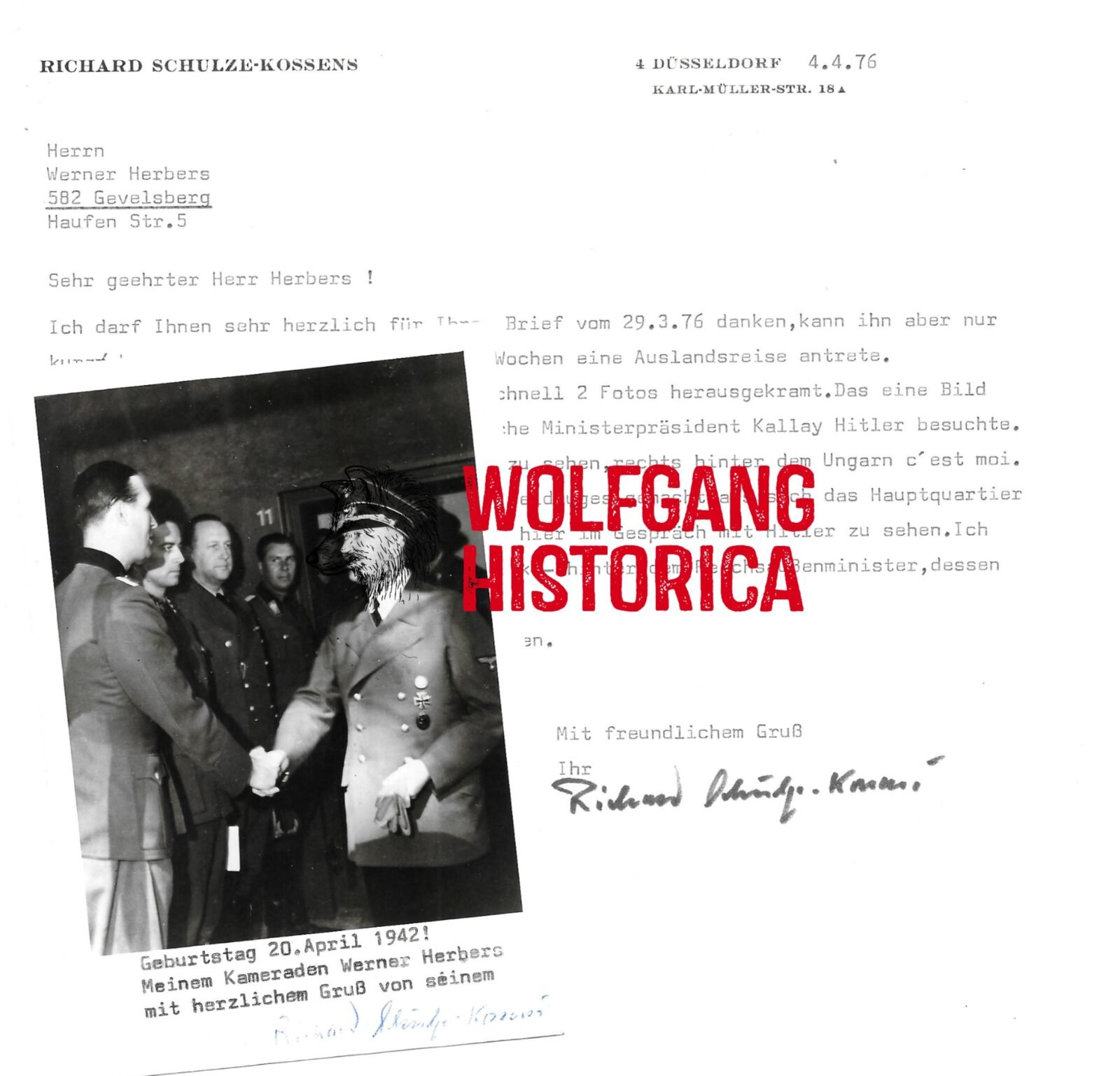Original Scarce Postwar Signature on a Postwar Photo & Letter of Richard Schulze-Kossens. SS-Obersturmbannführer Richard Schulze-Kossens (02.10.1914 † 03.07.1988) earned the Deutsches Kreuz in Gold on December 26, 1941 as SS-Hauptsturmführer with the 2. Kompanie/ “Leibstandarte-SS Adolf Hitler”. He also later served as the Personal Adjutant of Adolf Hitler; the SS-Panzer-Grenadier-Regiment 25 of the 12. SS-Panzer-Division “Hitlerjugend” and as Kommandeur of 38. SS-Grenadier-Division “Nibelungen“.