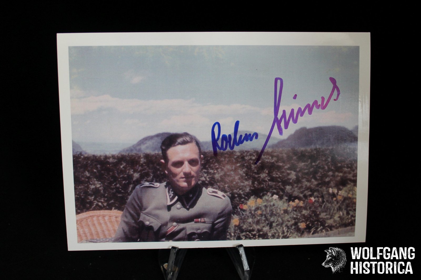 Original Postwar Signature on a Postwar Photo of Rochus Misch. SS-Untersturmführer Rochus Misch (29.07.1917 † 05.09.2013) served with the 1. SS-Panzer-Division “LSSAH” and afterwards with the Führerbegleitkommando (Führer Escort Command; FBK) as a bodyguard, courier, and telephone operator for Adolf Hitler. Misch was one of the last occupants of the Führerbunker in Berlin, May 1945 where he also witnessed the bodies of Eva & Adolf Hitler as well as the Goebbels family. Condition as seen. Postcardsize.