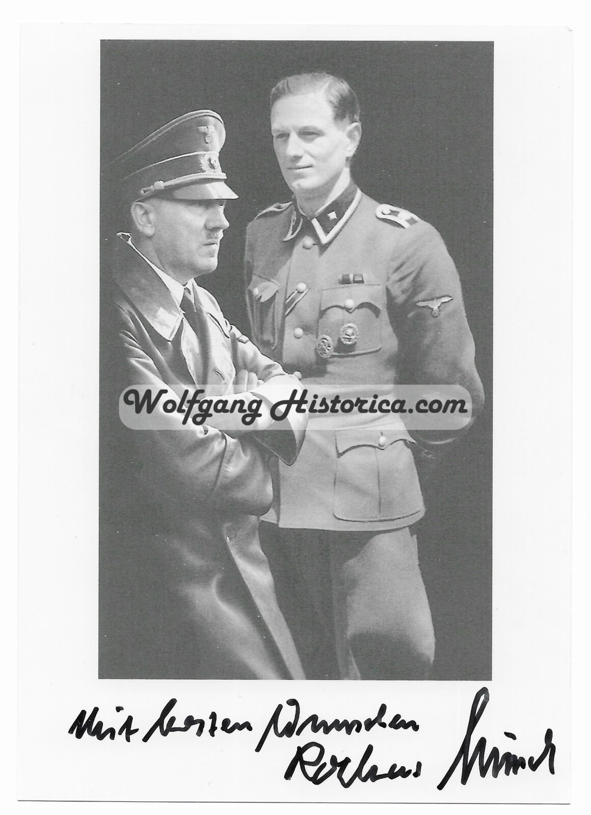 Original Postwar Signature on a Postwar Photocopy of Rochus Misch. SS-Untersturmführer Rochus Misch (29.07.1917 † 05.09.2013) served with the 1. SS-Panzer-Division “LSSAH” and afterwards with the Führerbegleitkommando (Führer Escort Command; FBK) as a bodyguard, courier, and telephone operator for Adolf Hitler. Misch was one of the last occupants of the Führerbunker in Berlin, May 1945 where he also witnessed the bodies of Eva & Adolf Hitler as well as the Goebbels family. Good condition. Measuring: 17,8×12,7cm.