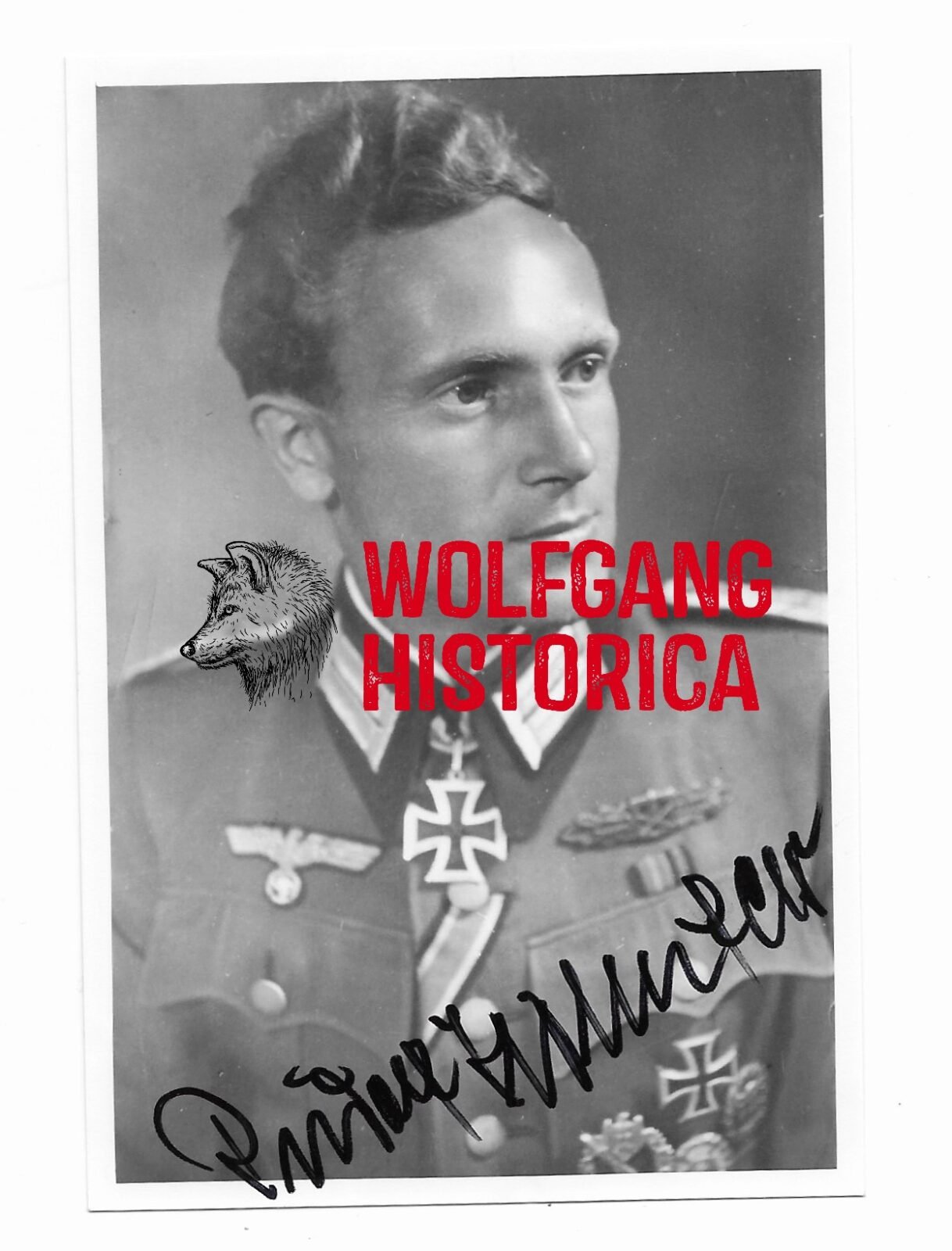 Original Postwar Signature on a Postwar Photo of Rudolf Kühnfels. Oberleutnant Rudolf Kühnfels (19.08.1917 † 17.02.1994) earned the Ritterkreuz des Eisernen Kreuzes on December 9, 1944 as Oberleutnant und Kompaniechef in the Jäger-Regiment 54 of the 100. Jäger-Division.