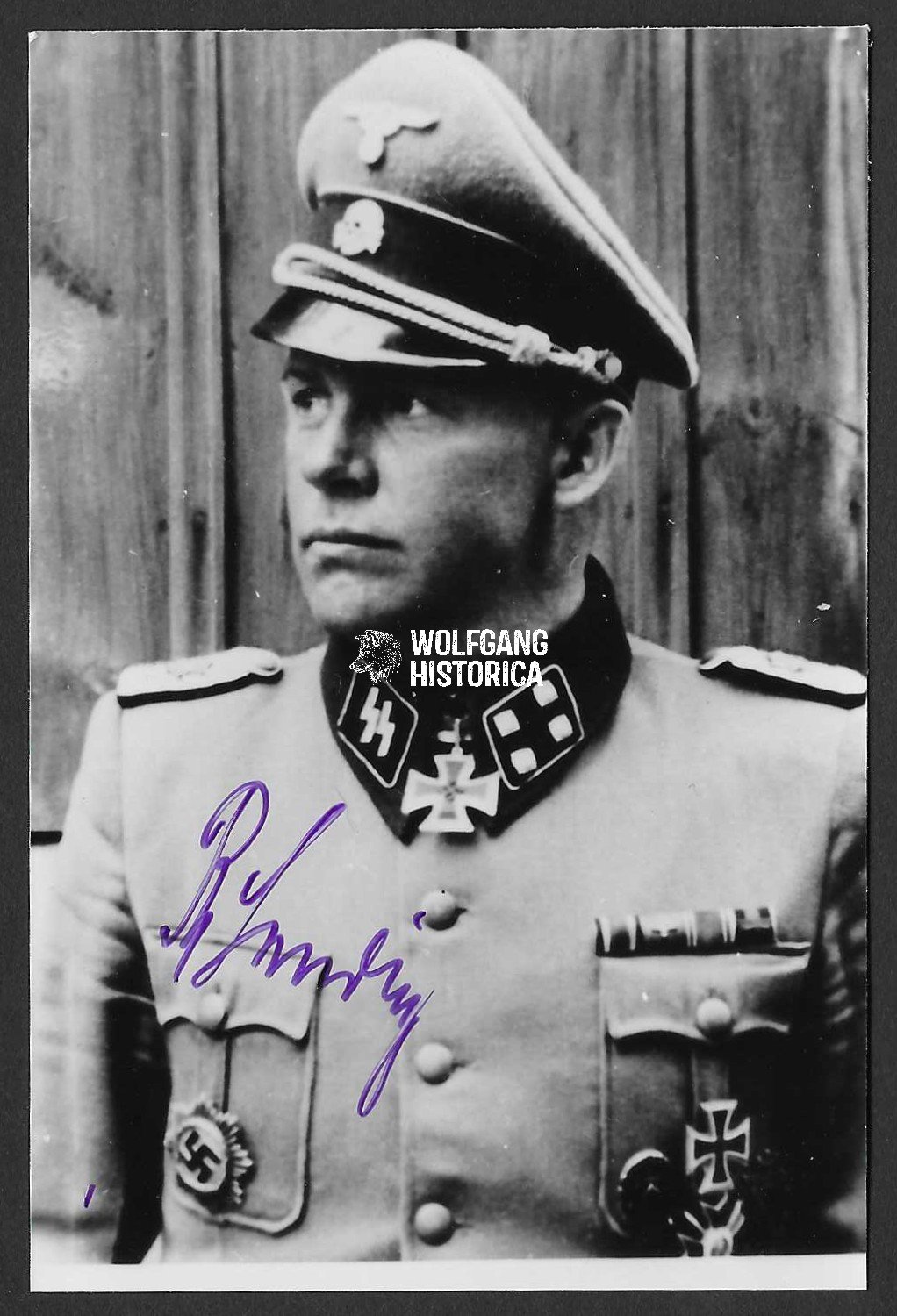 Original Postwar Signature on a Postwar Photo of Rudolf Sandig. SS-Obersturmbannführer Rudolf Sandig (11.09.1911 † 11.08.1994) earned the Ritterkreuz des Eisernen Kreuzes on May 5, 1943 as SS-Sturmbannführer und Kommandeur of the II. Bataillon/ SS-Panzer-Grenadier-Regiment 2 “LSSAH” of the 1. SS-Panzer-Division “LSSAH“. Condition as seen. Bit smaller as Postcardsize.