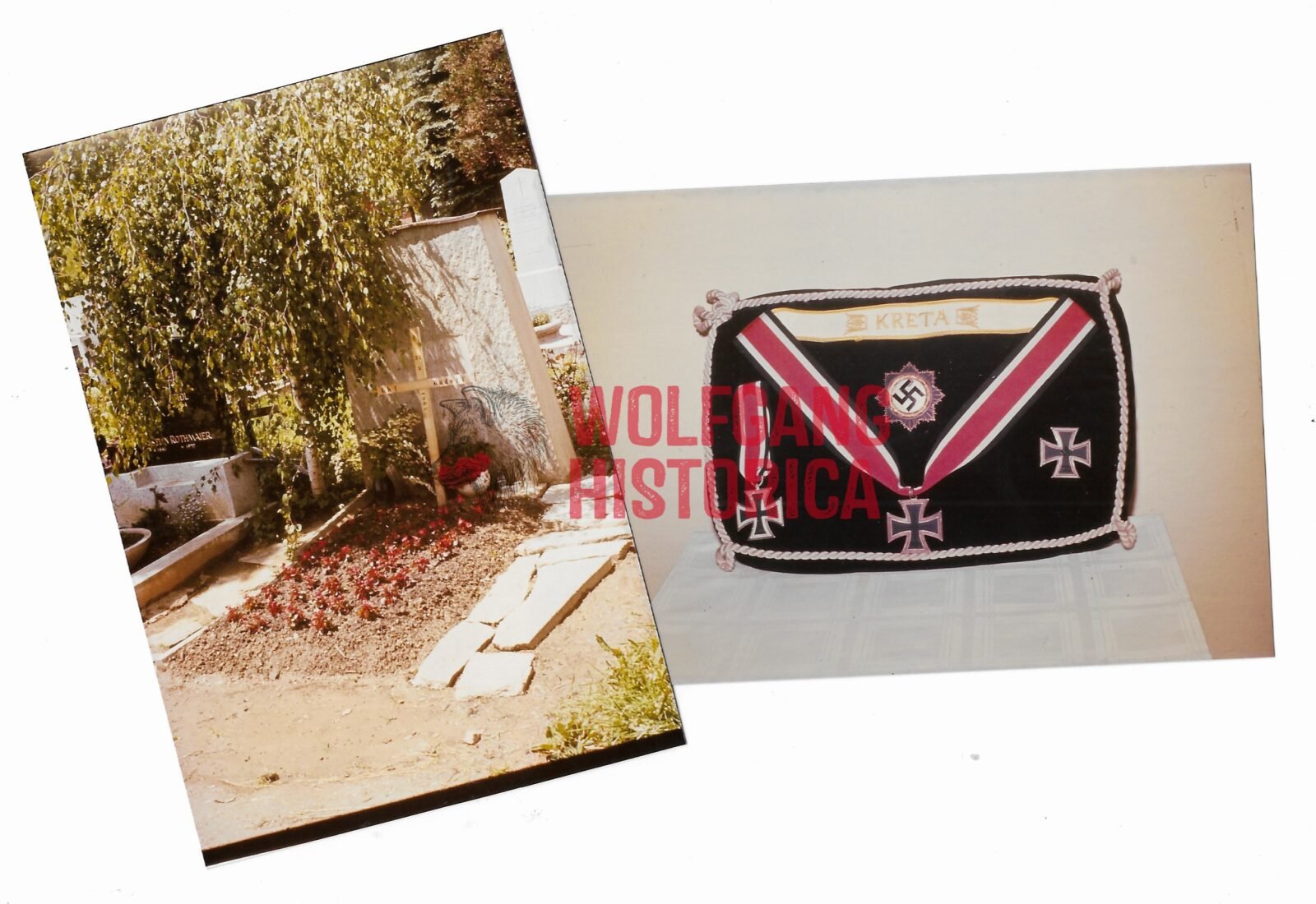 2x Postwar Photos of Award cushion and Grave of Rudolf Uhl. Leutnant Rudolf Uhl (02.04.1916 † 27.03.1965) earned the Ritterkreuz on November 5, 1944 as Leutnant und Adjutant of the II. Bataillon/ Gebirgsjäger-Regiment 141 of the 6. Gebirgs-Division. Good condition.
