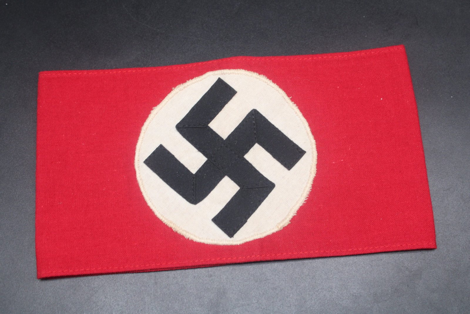 Original SA/NSDAP party sleeve armband in overall good – near mint condition. Three-piece construction. No tag. Condition as seen.
