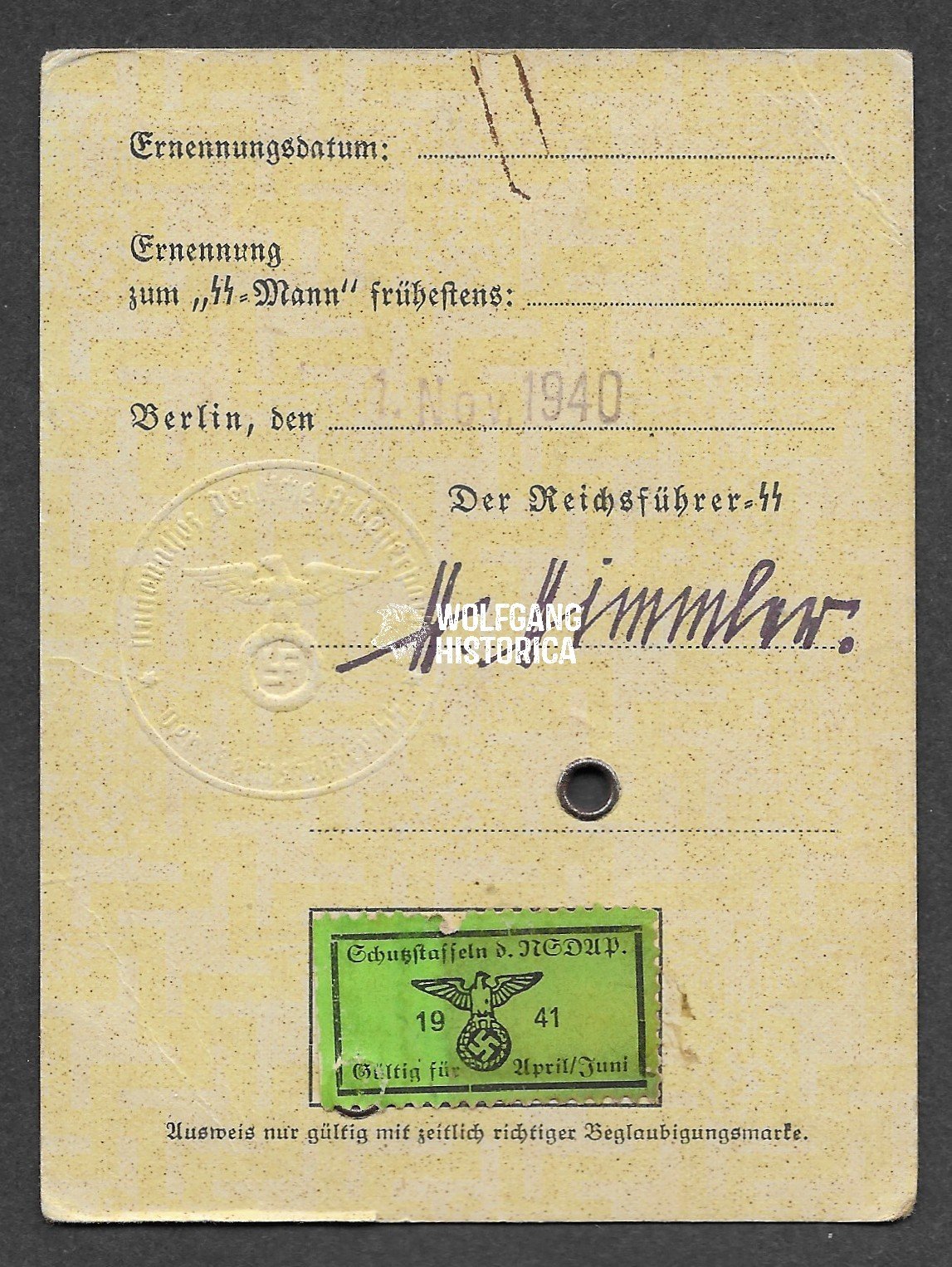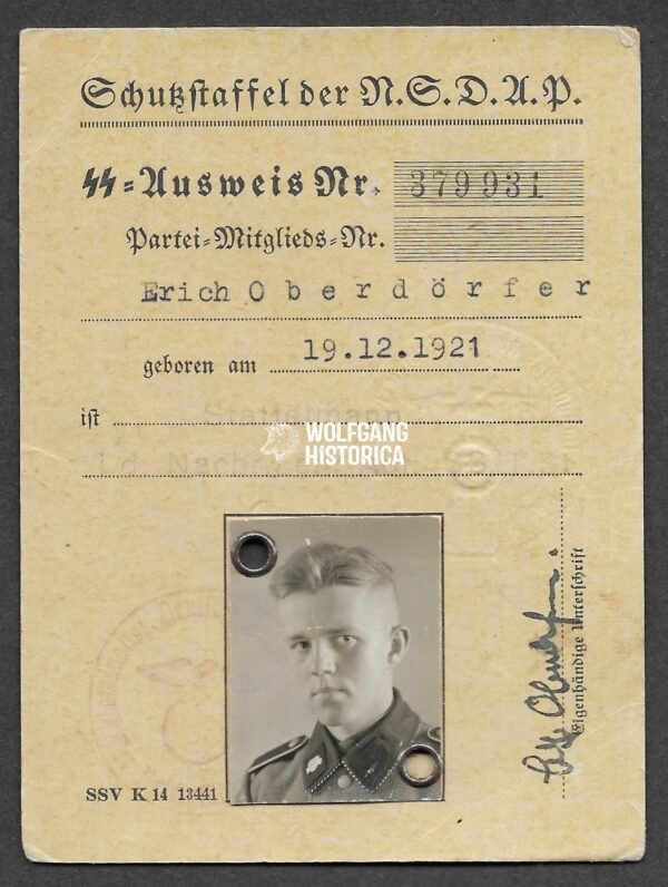 Original Schutzstaffel der NSDAP – SS-Ausweis (Nr. 379 931) authorized to SS-Staffelmann Erich Oberdörfer, born on December 19, 1921. Serving with the SS-Nachrichten-Ersatz-Abteilung of the SS-Totenkopf-Standarte. Issued on November 1, 1940. On the reverse, the Heinrich Himmler signature is a (rubber) stamp and not handsigned. Complete with photo, his signature, stamp(s) and blind-embossed seal (Blindprägestempel). These SS-Ausweis were issued to SS personnel before the Soldbuch.