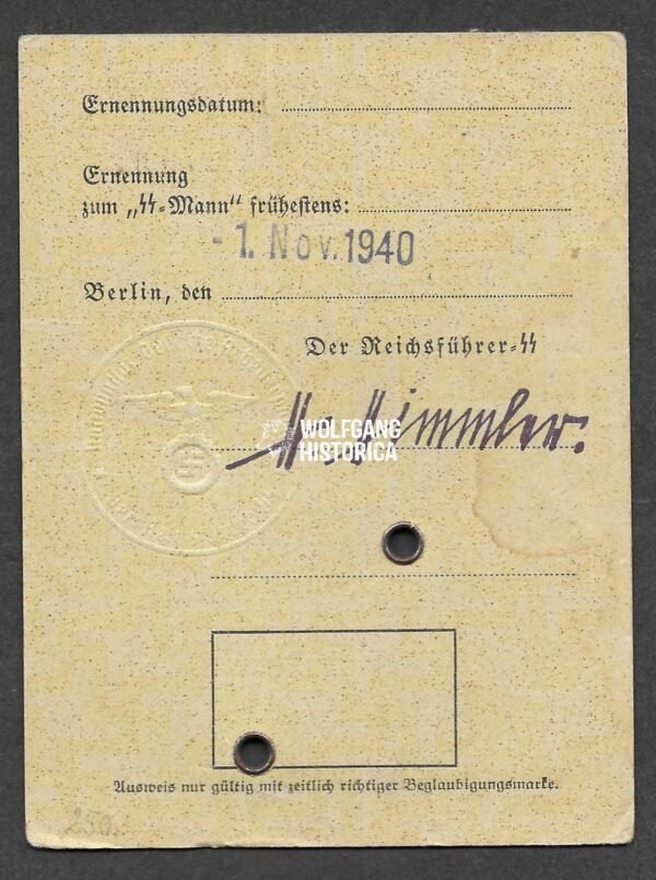 Original Schutzstaffel der NSDAP – SS-Ausweis (Nr. 379 917) authorized to SS-Staffelmann Karl Ris, born on November 27, 1919. Serving with the SS-Nachrichten-Ersatz-Abteilung of the SS-Totenkopf-Standarte. Issued on November 1, 1940. On the reverse, the Heinrich Himmler signature is a (rubber) stamp and not handsigned. Complete with photo and blind-embossed seal (Blindprägestempel). Typical un-issued SS-Ausweis that was kept in a file of the particular soldier. These SS-Ausweis were issued to SS personnel before the Soldbuch.