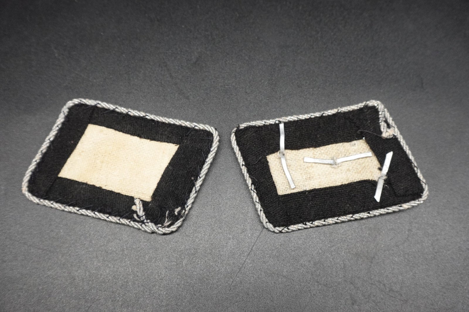 Original matched pair of Flemish Waffen-SS officer collar tabs for the rank of SS-Untersturmführer. The set consists of one rank tab displaying three pip devices and one unit tab bearing the double Sig rune, both constructed on black wool with silver-white embroidered details and twisted cord edging.