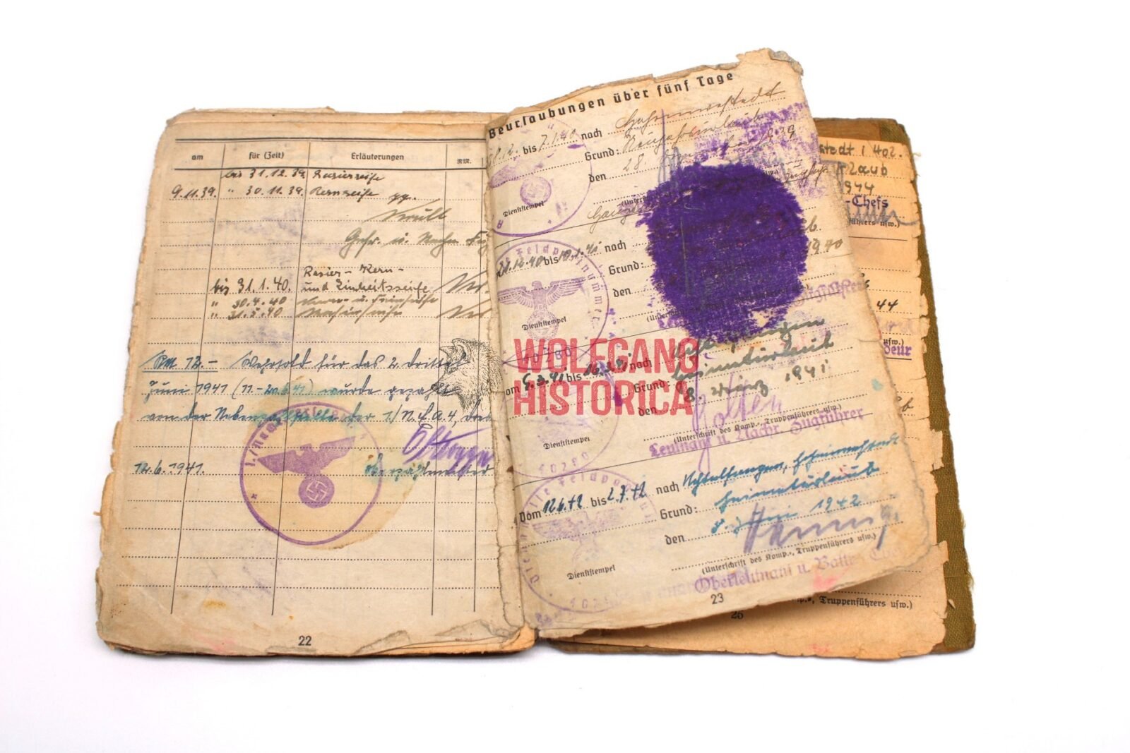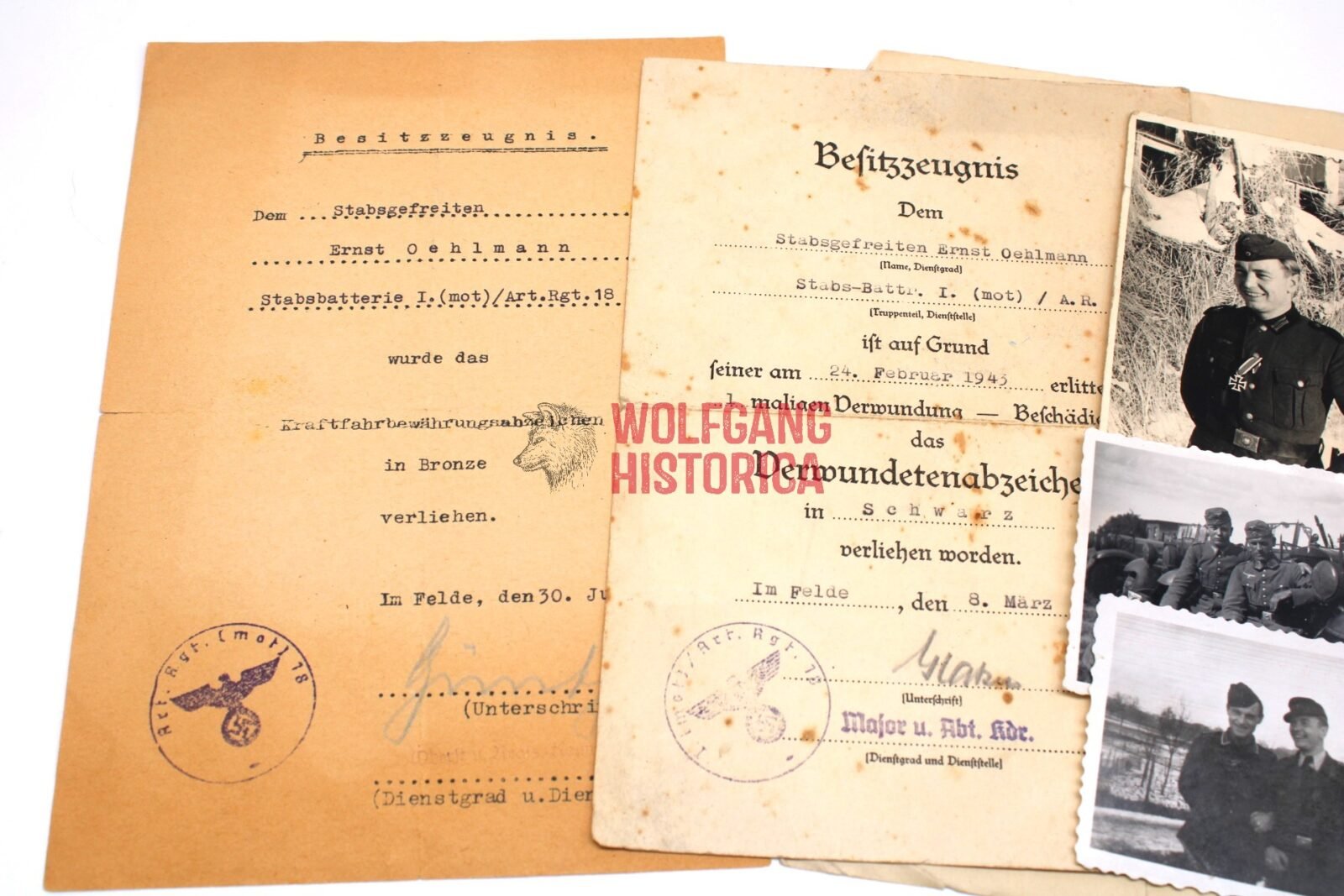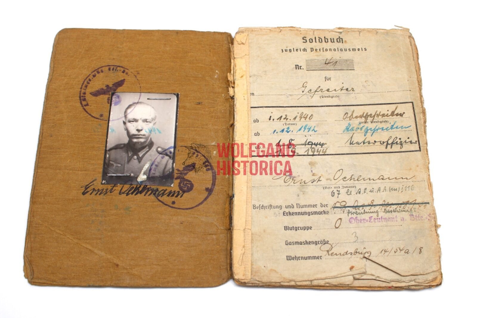 Original Soldbuch & 2 Award documents of Unteroffizier Ernst Oehlmann, born on January 13, 1915 in Linz a.d. Donau and was a Beamter. He divorced on 25.2.43 (?). The Soldbuch was opened on September 12, 1939 by Nachrichten-Batterie/ Artillerie-Ersatz-Abteilung 158. He wore the Erkennungsmarke: -67- le.A.e.U.A.A.(m) I.116.