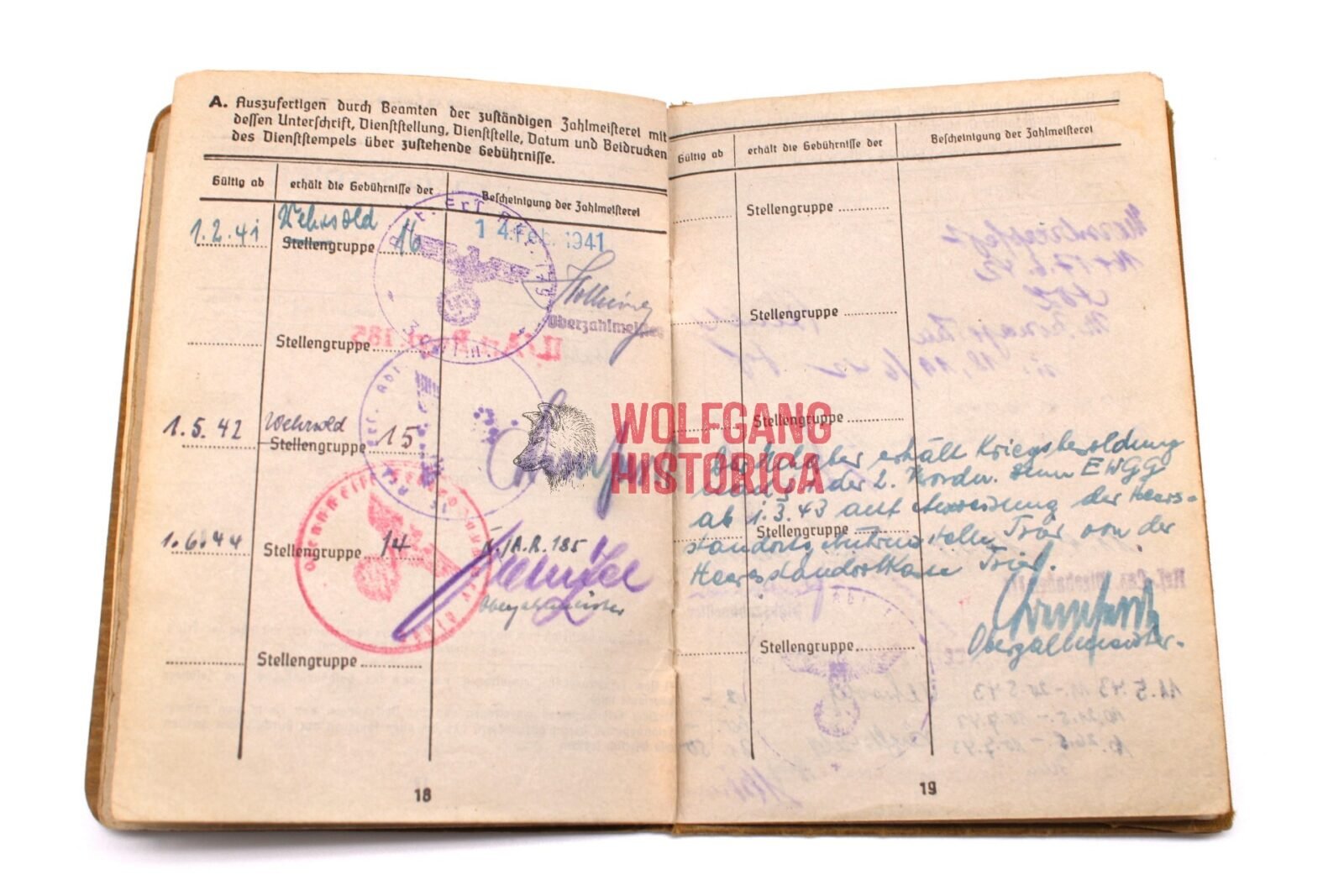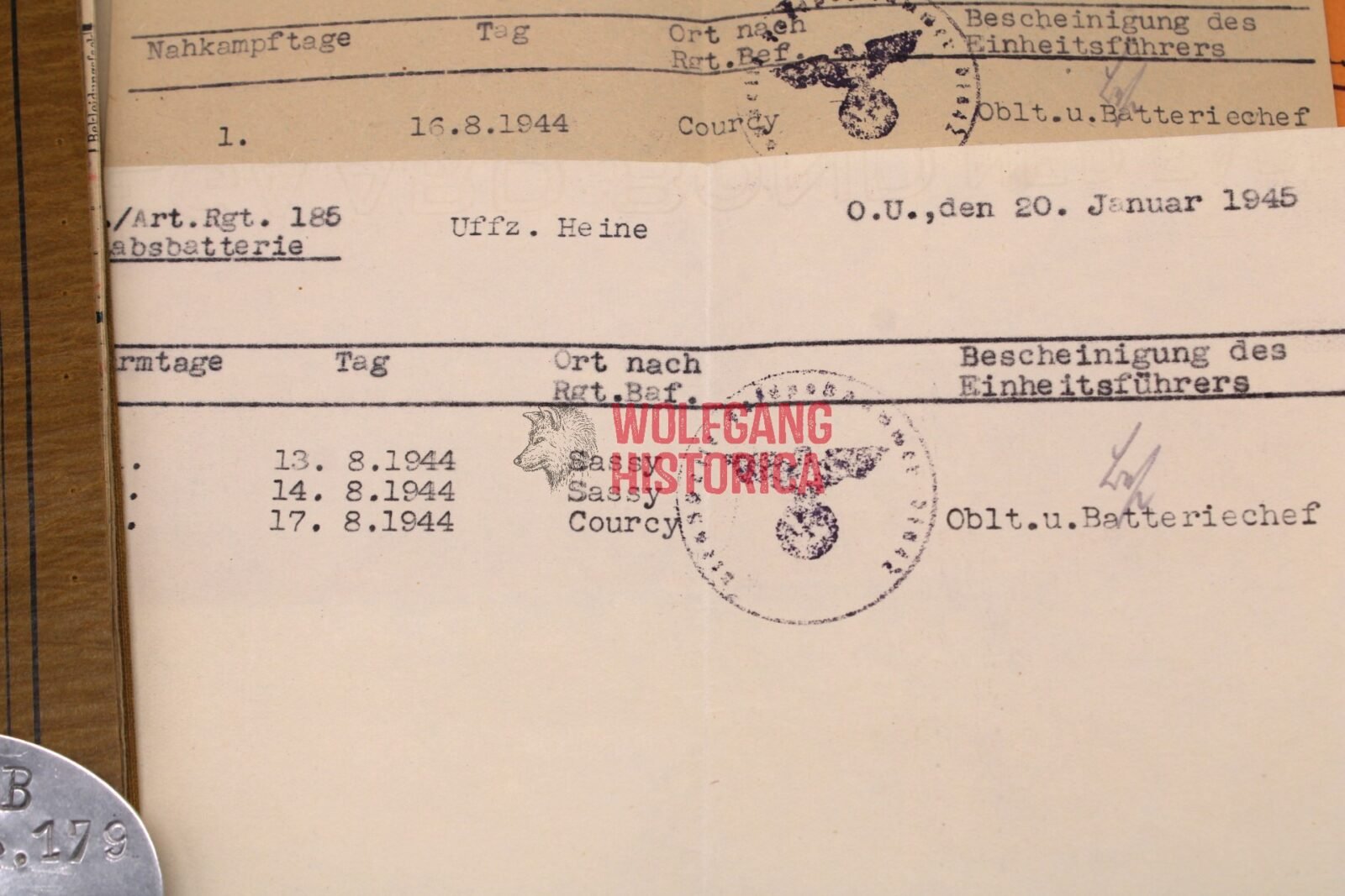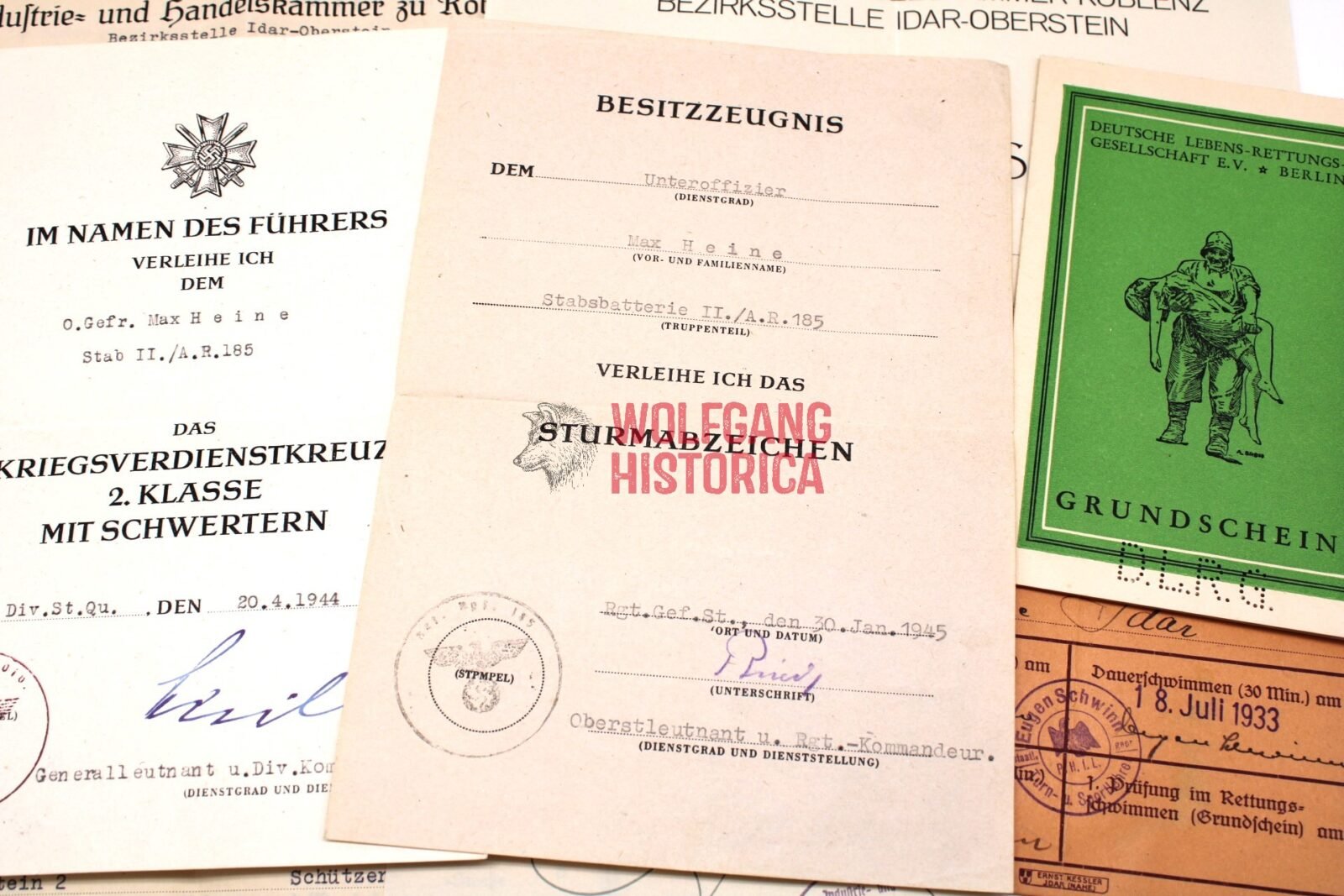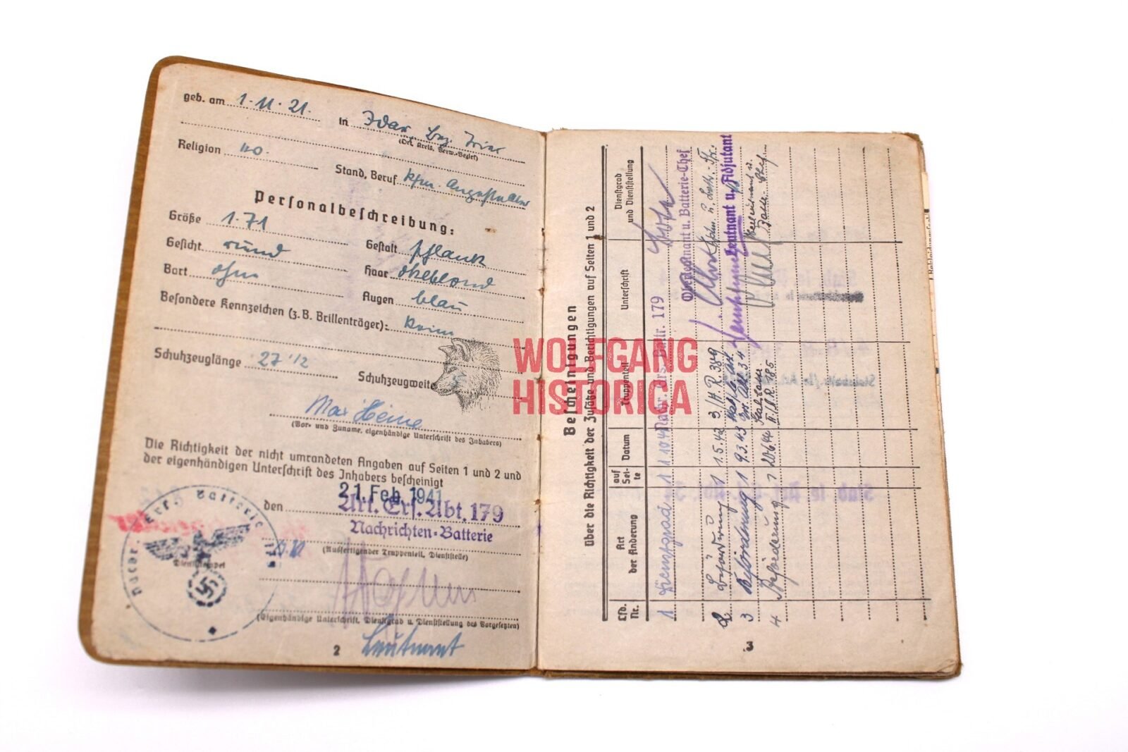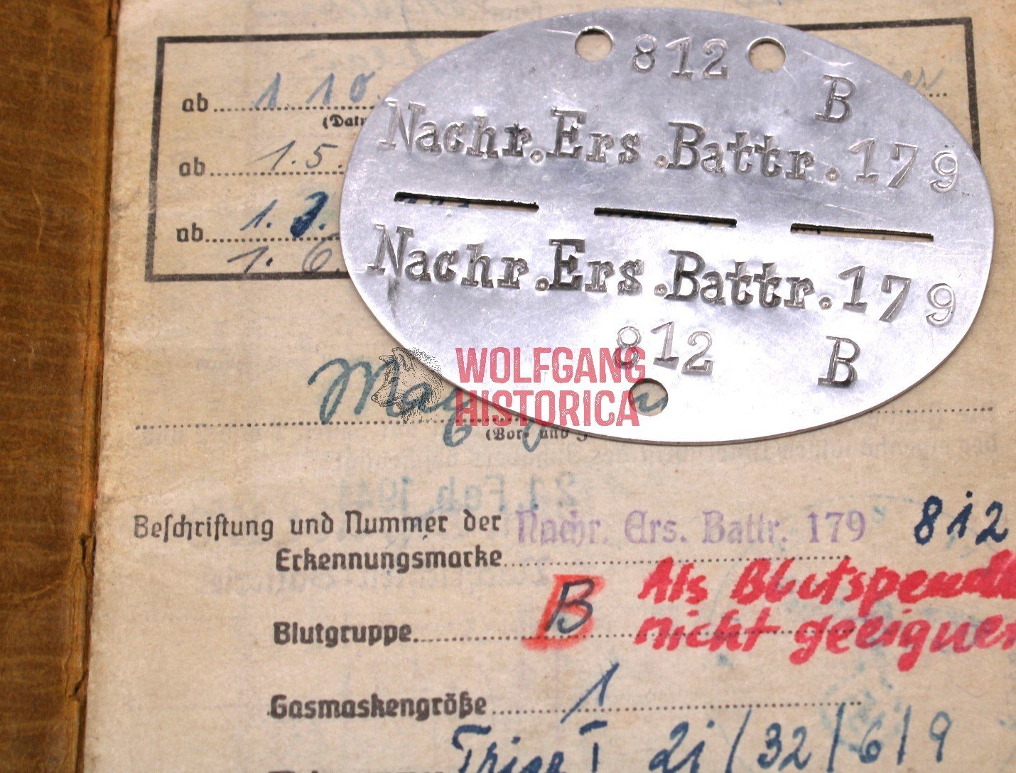 Original Soldbuch, Erkennungsmarke & Award Documents of Max Heine, born on November 1, 1921 in Idar, Trier. Soldbuch opened on February 21, 1941 by Nachrichten-Batterie/ Artillerie-Ersatz-Abteilung 179. He wore the Erkennungsmarke: -812- Nachr.Ers.Bttr.179.