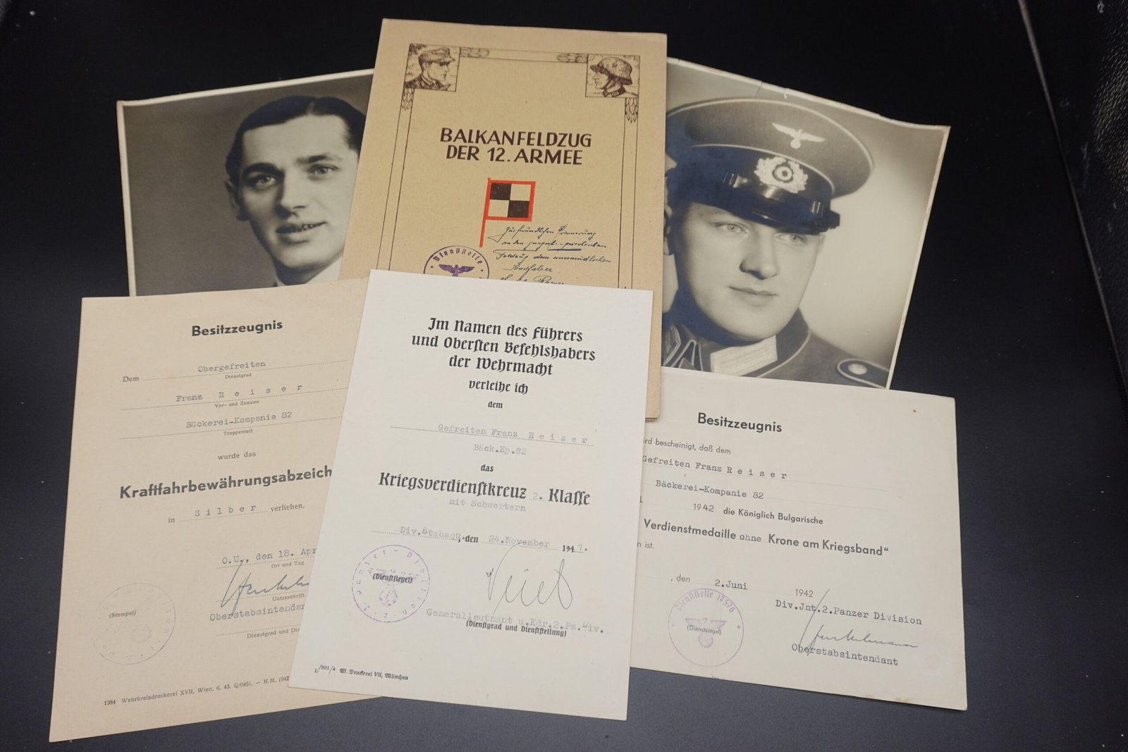 Original grouping consisting of 3x award documents, 2x A4 photos and 1x Balkanfeldzug 12. Armee folder of Gefreiter Reiser, who served with the Bäckerei-Kompanie 82 of the 2. Panzer-Division. He earned the Kraftfahrbewährungsabzeichen in Silber, Kriegsverdienstkreuz 2. Klasse en Königl. Bulg. Verdienstmedaille ohne Krone am Kriegsband. Condition as seen.