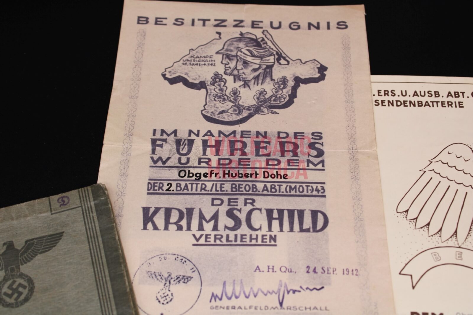 - Award document for the Krimschild. Earned on September 24, 1942. Stamp of by Generalfeldmarschall Erich von Manstein. VERY RARE UNIT VARIANT!
