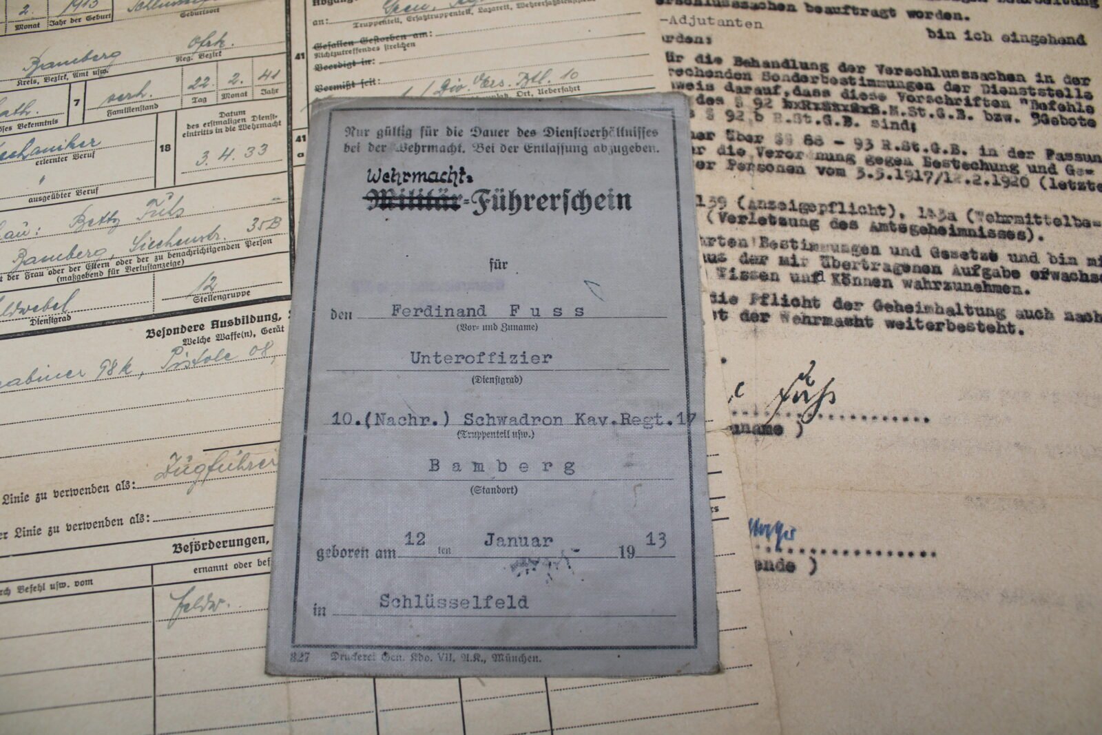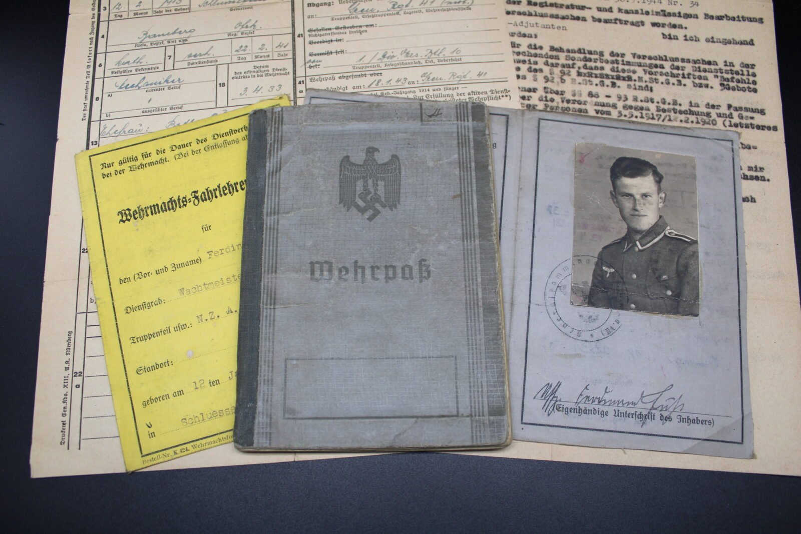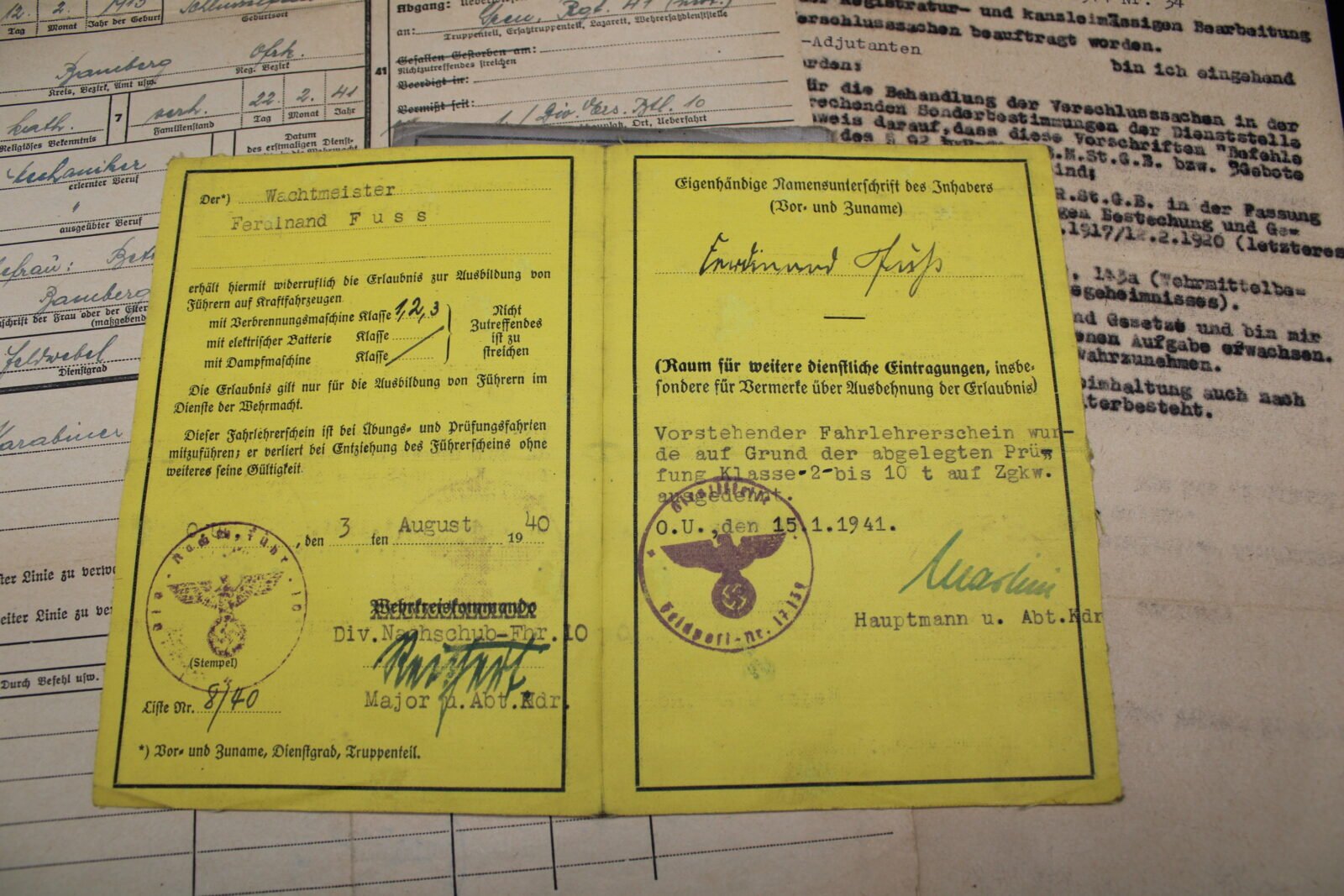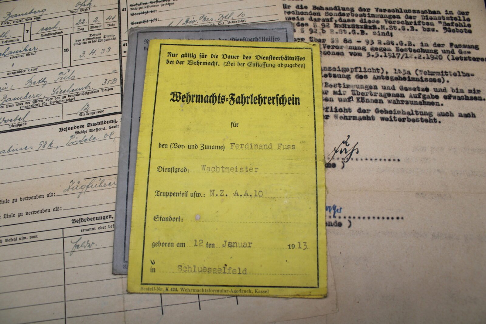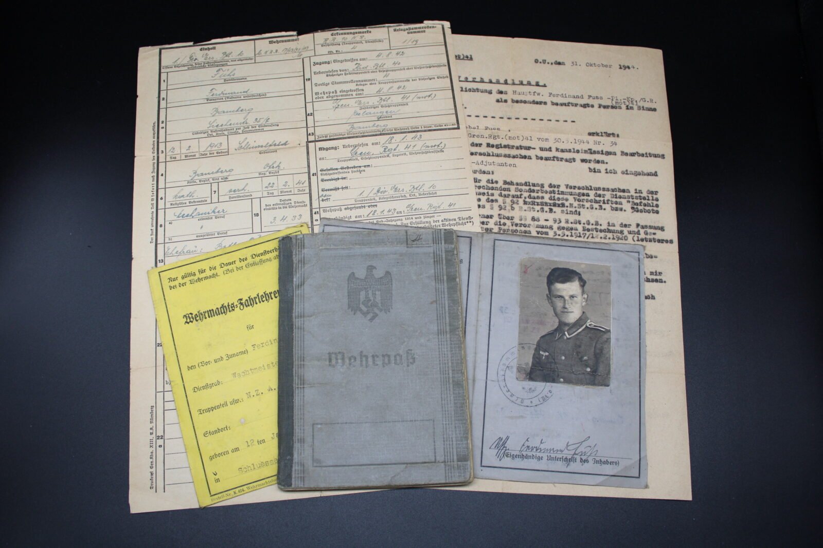 Original Wehrpass, Wehrmacht-Führerschein, Wehrmacht-Fahrlehrerschein and some documents from Oberfeldwebel Fuß. He served in various interesting units such as Reiter-Regiment 17, Kavallerie-Regiment 17, Aufklärungs-Abteilung 10 before ending up with Grenadier-Regiment 41. During his service, he earned various award: Reichssportabzeichen in Bronze, Dienstauszeichnung IV. Klasse, Erinnerungsmedaille an den 13. März 1938, Medaille zur Erinnerung an den 1. Oktober 1938, Eisernes Kreuz 2. Klasse, Winterschlacht im Osten 1941/42, Verwundetenabzeichen in Schwarz and the Kriegsverdienstkreuz 2. Klasse.