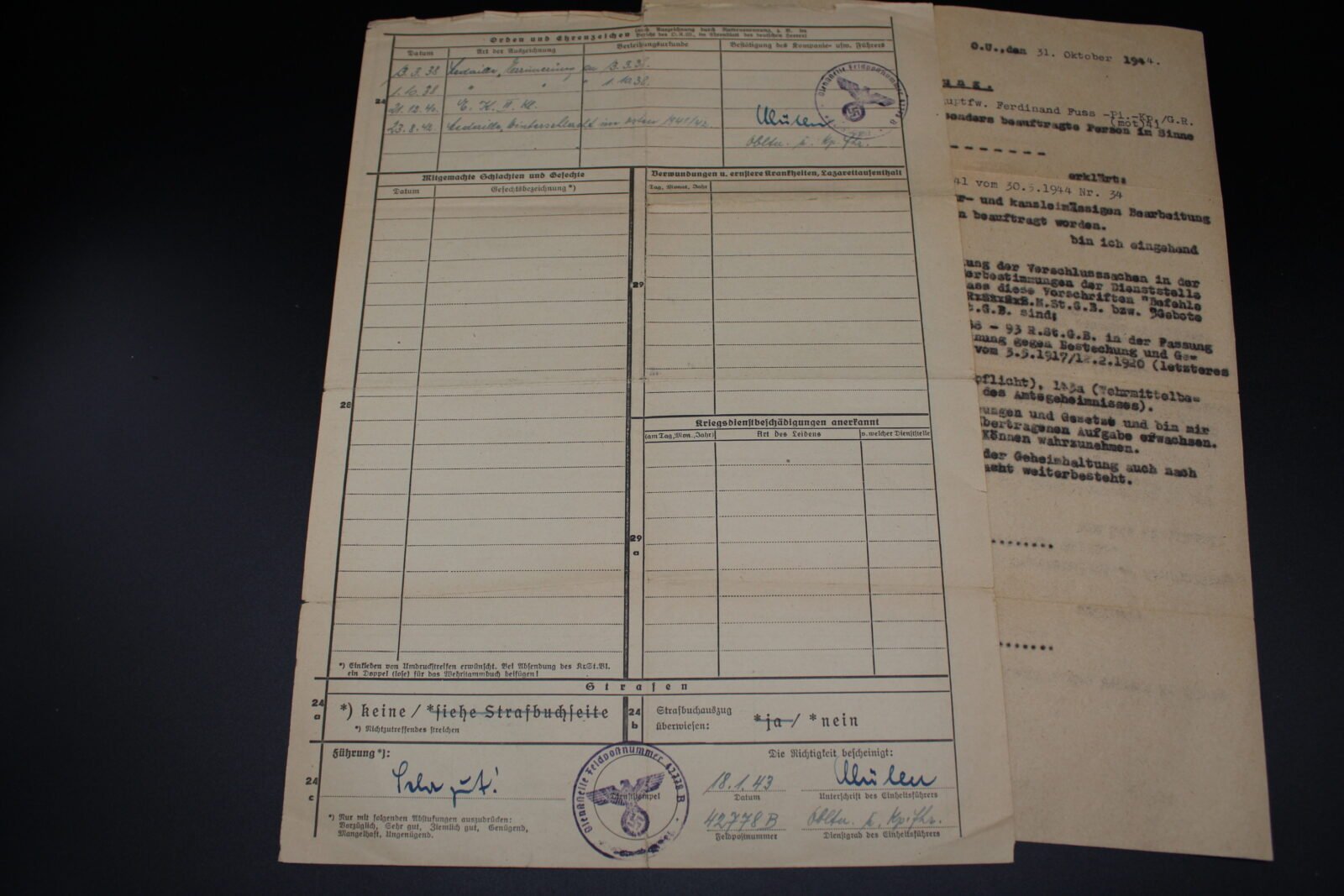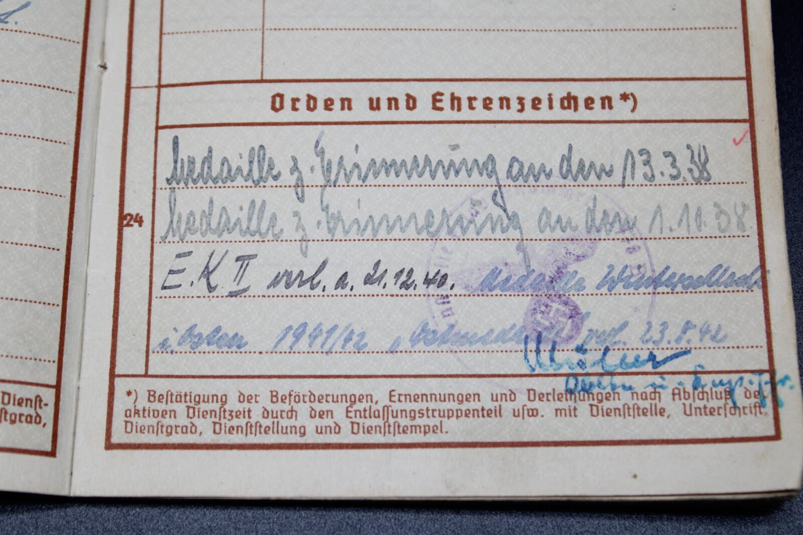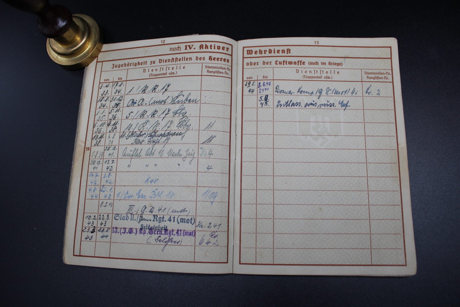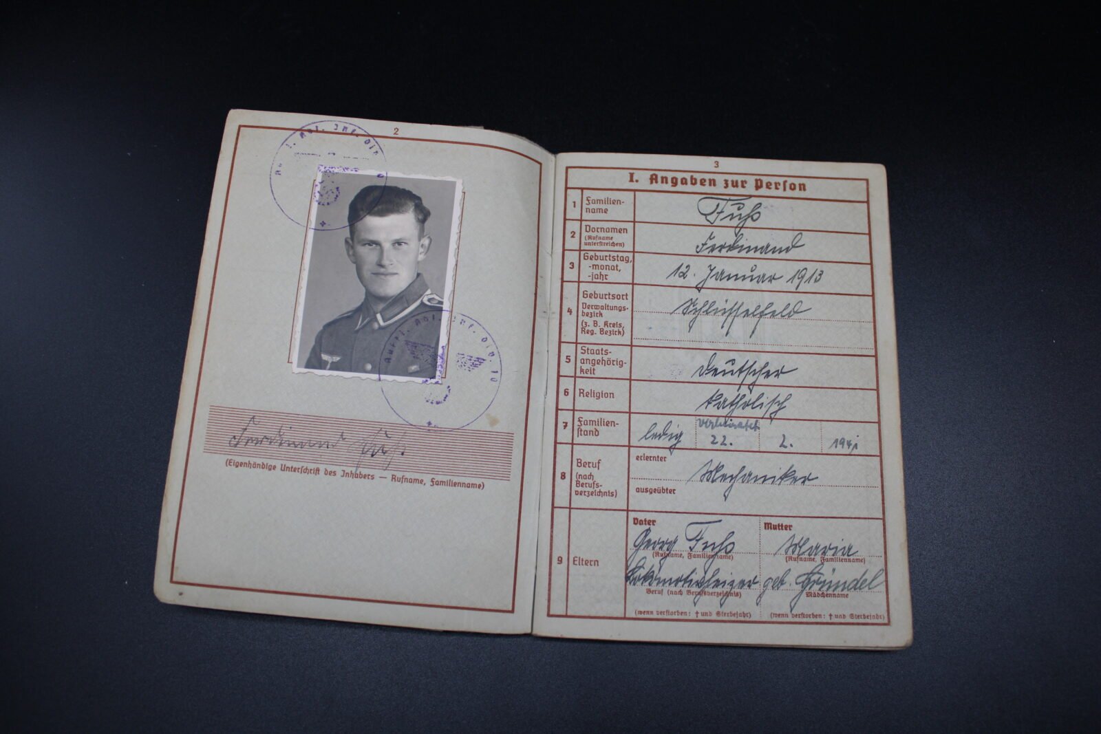 Original Wehrpass, Wehrmacht-Führerschein, Wehrmacht-Fahrlehrerschein and some documents from Oberfeldwebel Fuß. He served in various interesting units such as Reiter-Regiment 17, Kavallerie-Regiment 17, Aufklärungs-Abteilung 10 before ending up with Grenadier-Regiment 41. During his service, he earned various award: Reichssportabzeichen in Bronze, Dienstauszeichnung IV. Klasse, Erinnerungsmedaille an den 13. März 1938, Medaille zur Erinnerung an den 1. Oktober 1938, Eisernes Kreuz 2. Klasse, Winterschlacht im Osten 1941/42, Verwundetenabzeichen in Schwarz and the Kriegsverdienstkreuz 2. Klasse.