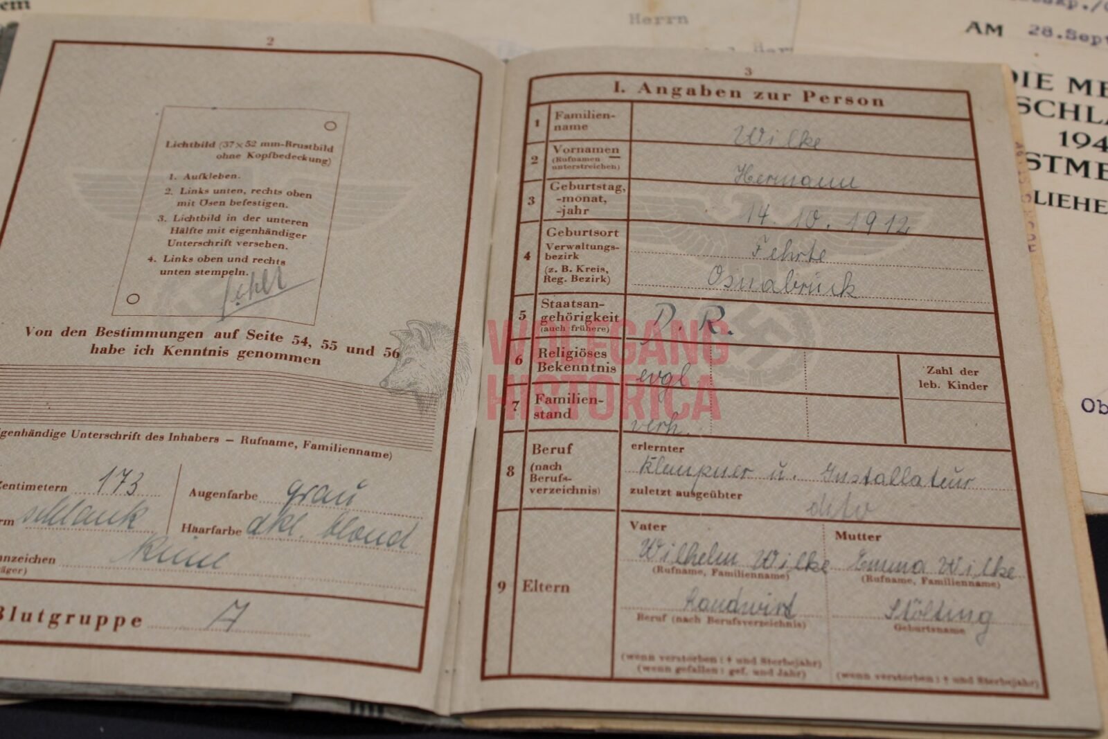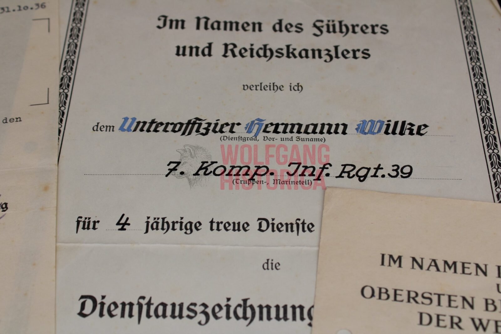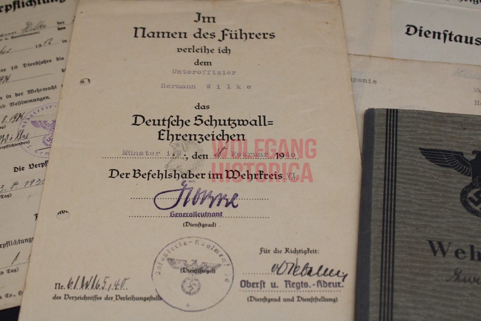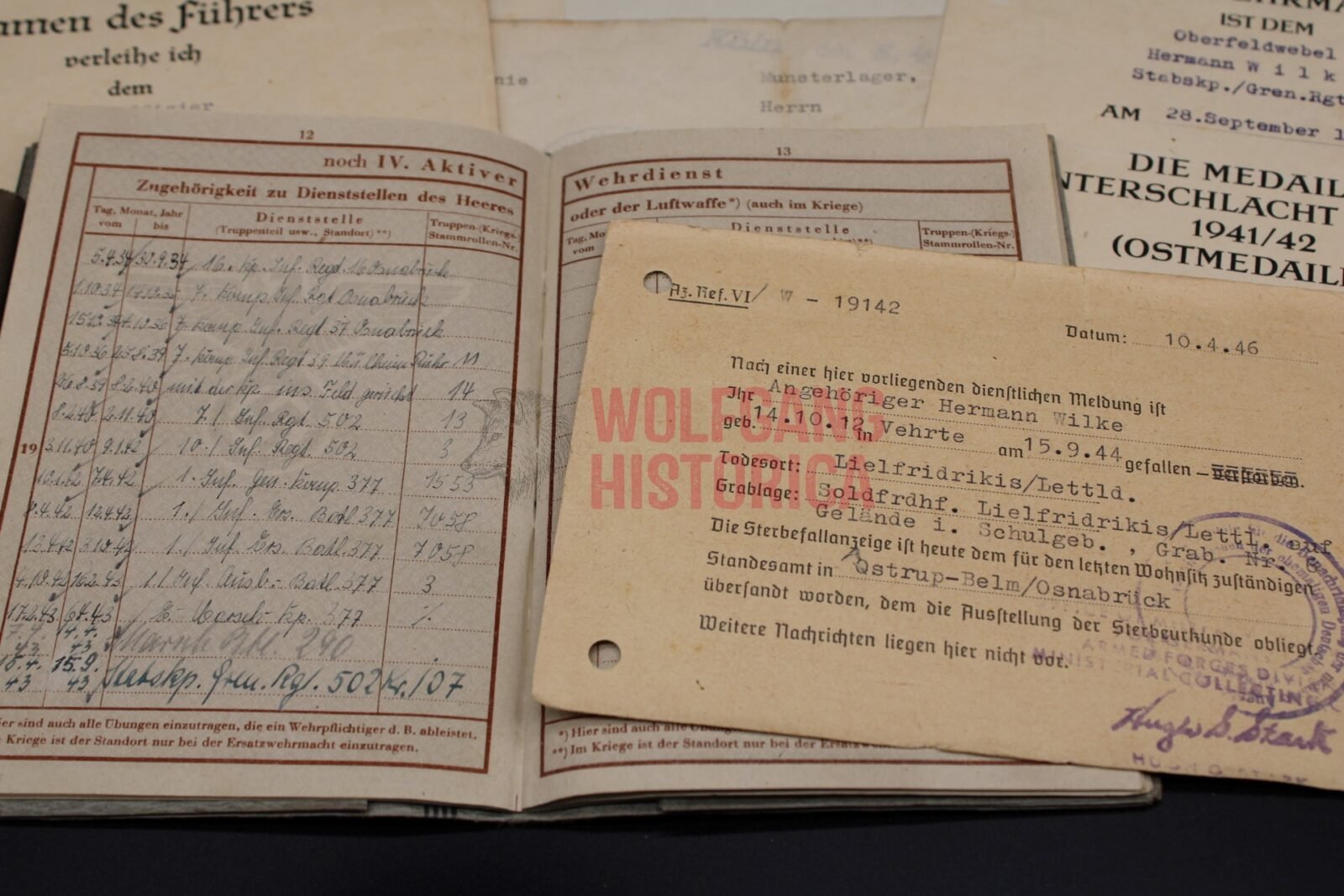 Set of Oberfeldwebel Hermann Wilke, who served with the Grenadier-Regiment 502 of the 290. Infanterie-Division. He met his fate on September 15, 1944 in Latvia when he was Killed in Action. During his service, he earned 8x awards! The Dienstauszeichnung IV. Klasse, Eisernes Kreuz 2. Klasse, Deutsche Schutzwall-Ehrenzeichen, Infanterie-Sturmabzeichen, Eisernes Kreuz 1. Klasse, Winterschlacht im Osten, Verwundetenabzeichen in Schwarz & Nahkampfspange I. Klasse in Bronze!