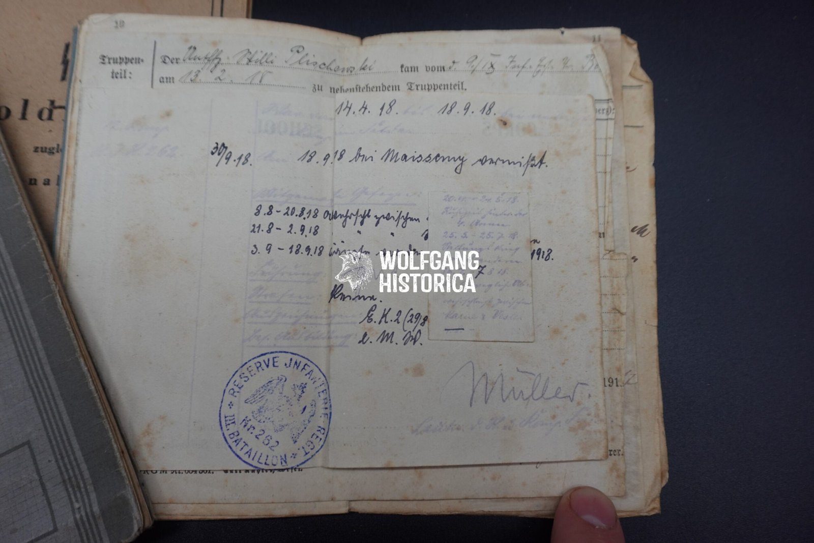 Original SS-Soldbuch, Wehrpass and Militärpaß of a Leutnant der Feldgendarmerie and eventually promoted on May 1, 1945 to Revier-Hauptmann der Schutzpolizei! The Militärpaß is for his World War I service, where he was awarded the EK2, EKF and VWA, but more interestingly, that he went MIA in September 1918 in France. Perhaps captured or MIA during an attack, although he eventually came back.