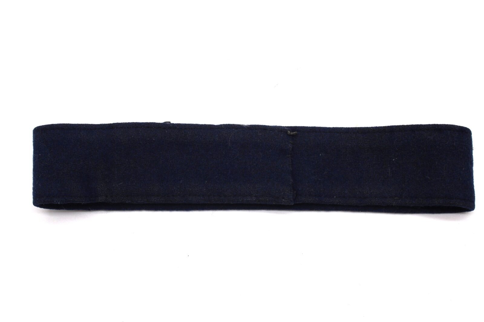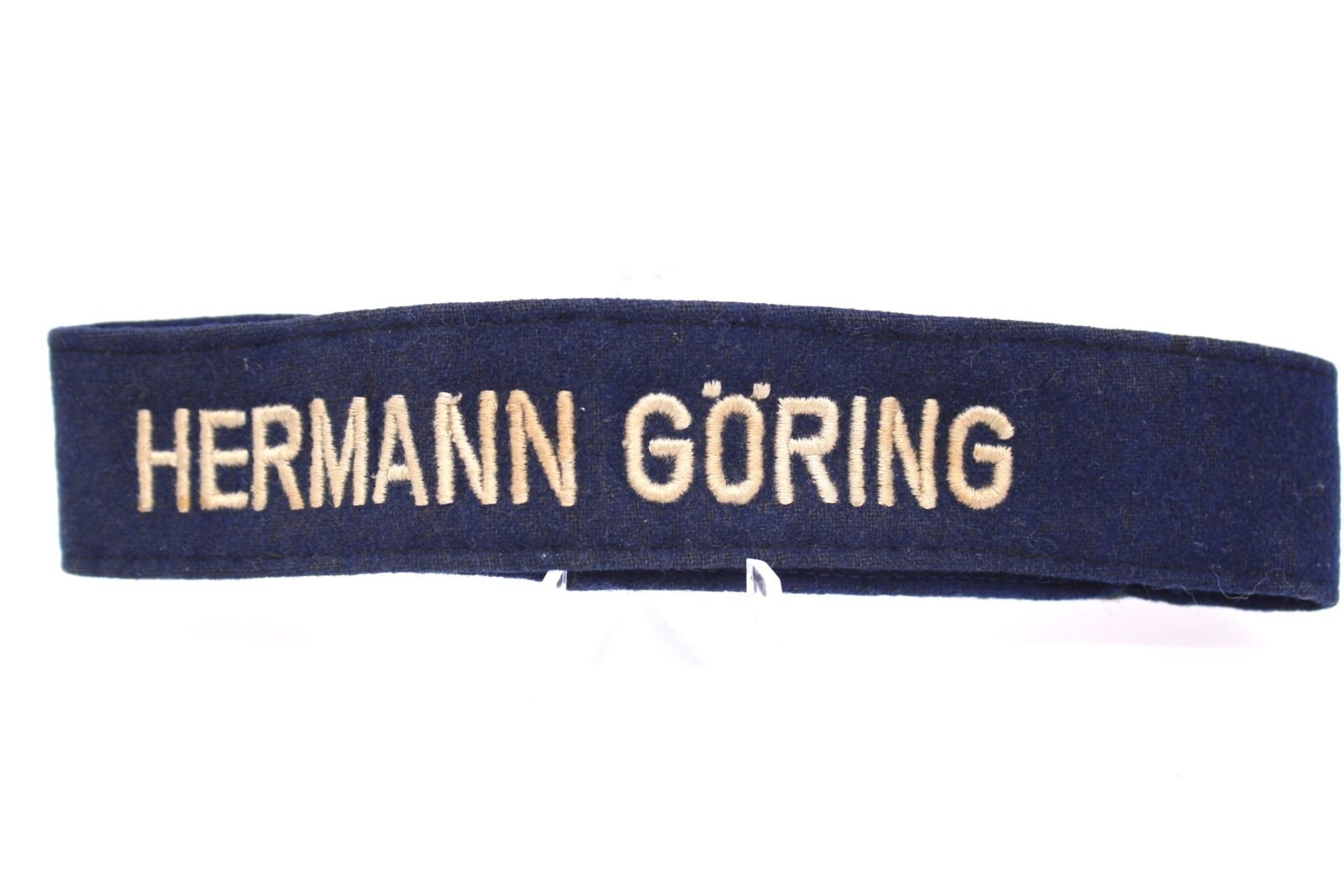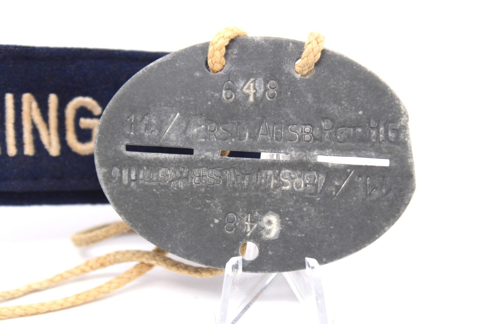Original worn and still stitched together “Hermann Göring” cuff title, made from wool fabric, with “Hermann Göring” Erkennungsmarke. Set came together. Condition as seen.