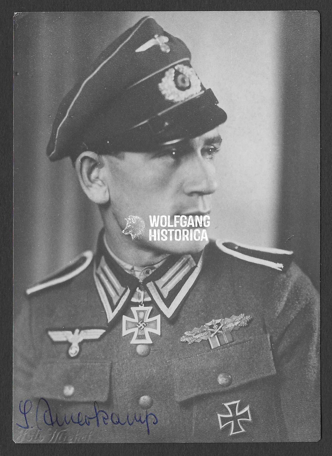 Original Postwar Signature on a Postwar Photo of Siegfried Amerkamp. SS-Oberscharführer Siegfried Amerkamp (20.03.1920 † 01.09.1995) earned the Ritterkreuz on November 22, 1943 as Obergefreiter und MG-Schütze & stellv. Gruppenführer 1 in the Sturmkompanie/ Grenadier-Regiment 459 of the 251. Infanterie-Division. He later was transferred to the 17. SS-Panzer-Grenadier-Division “Götz von Berlichingen”. Good Condition. Postcardsize.