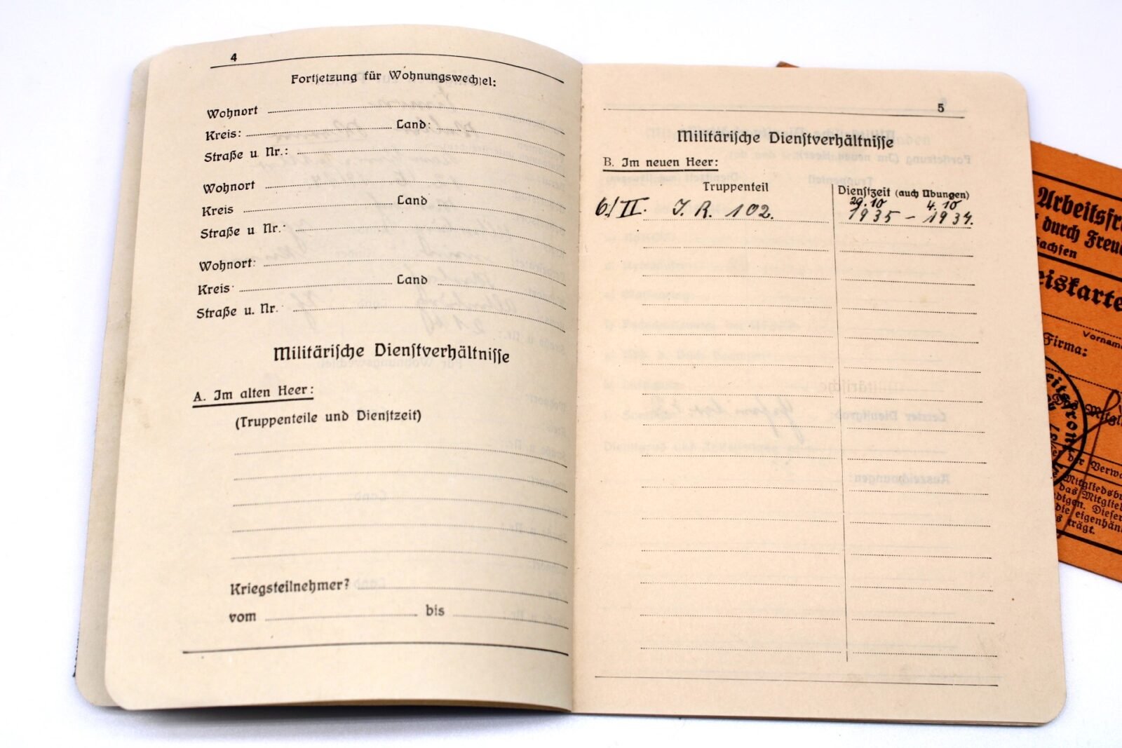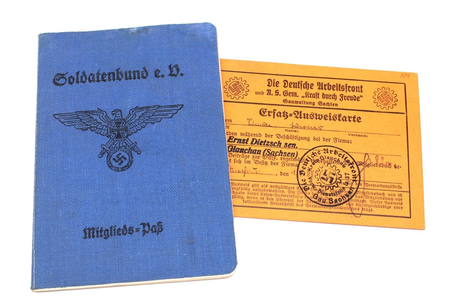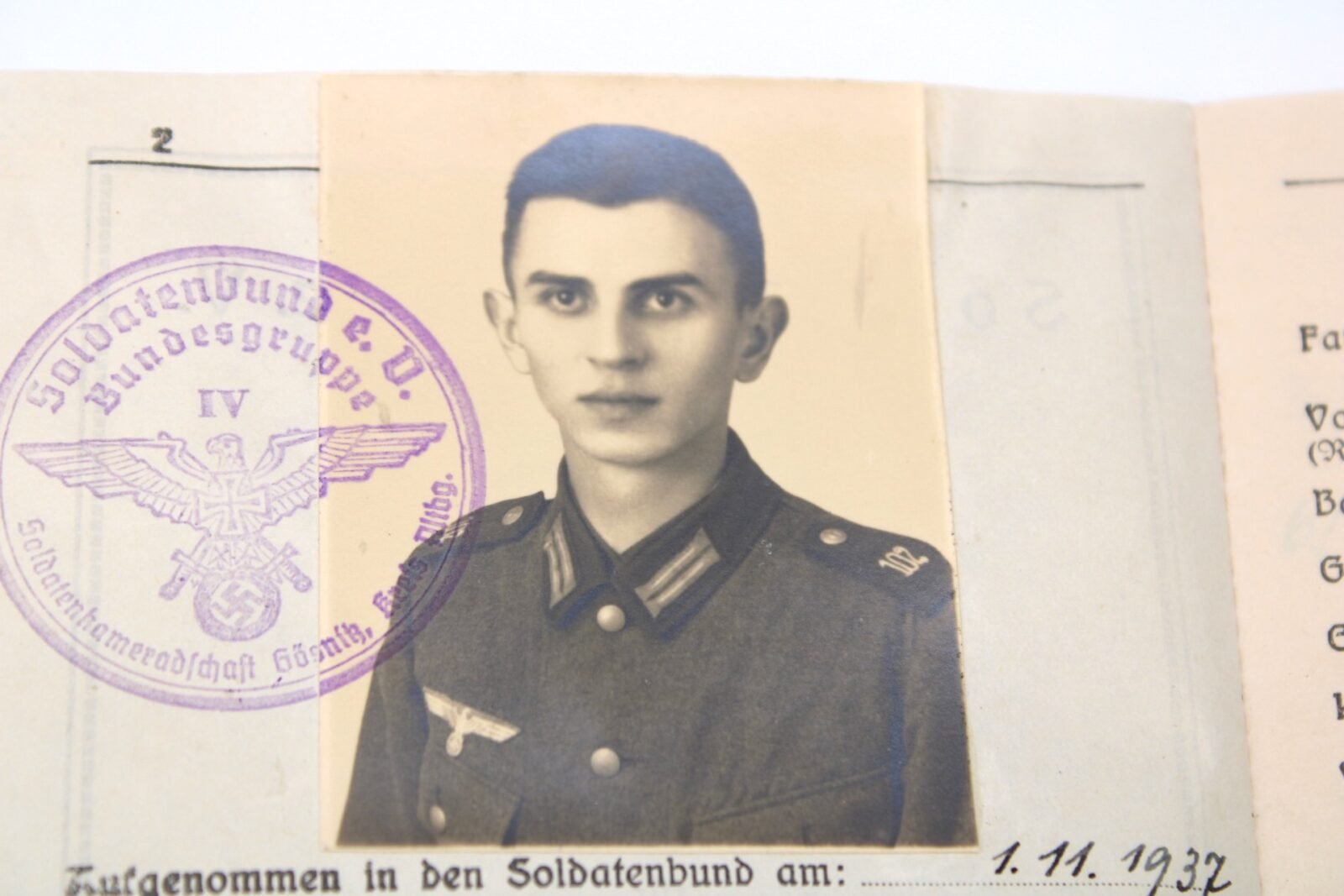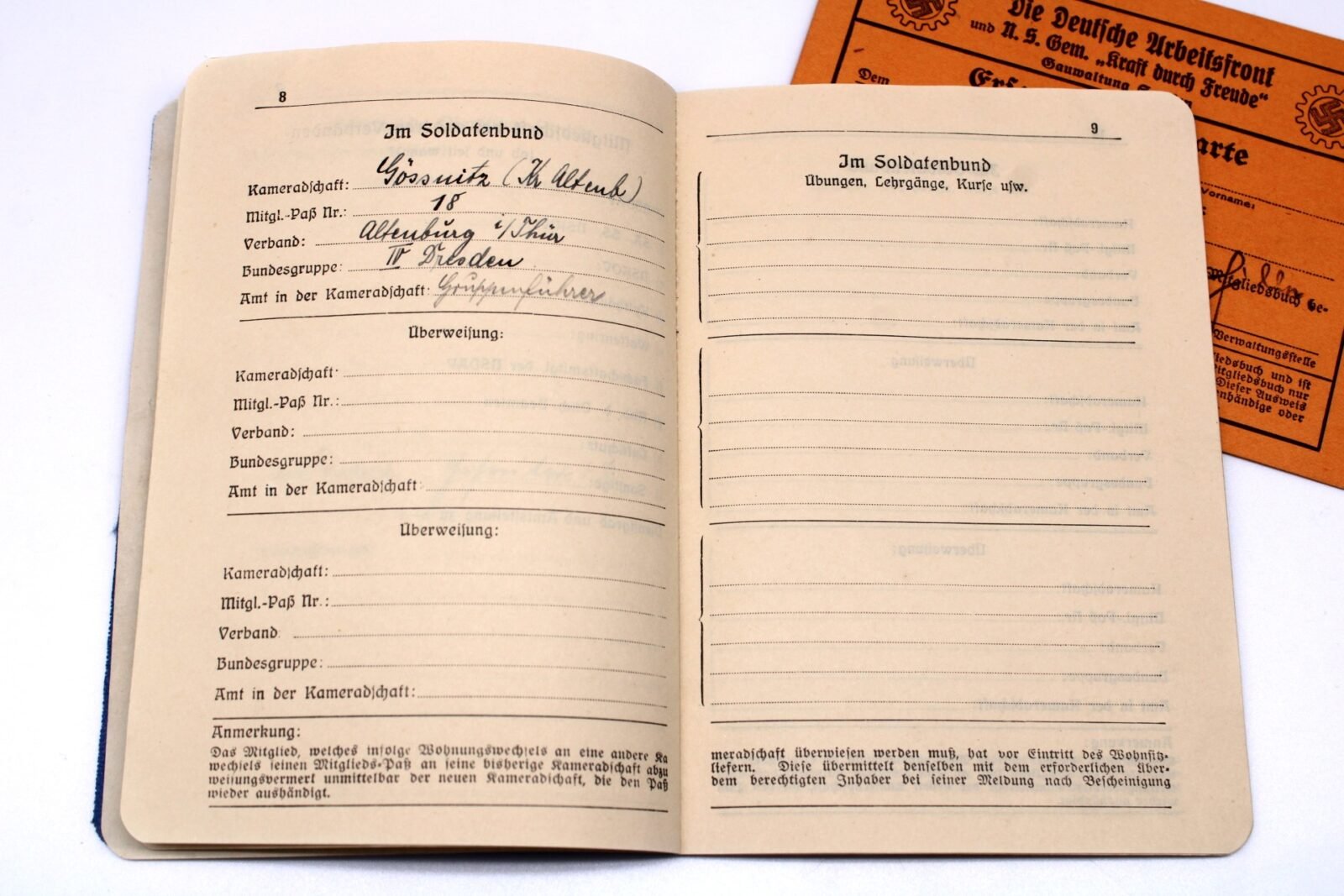 Soldatenbund e.V. Mitglieds-Paß. Complete with photo, filled out and with stamps. Comes with a DAF card of the same person. Good condition.