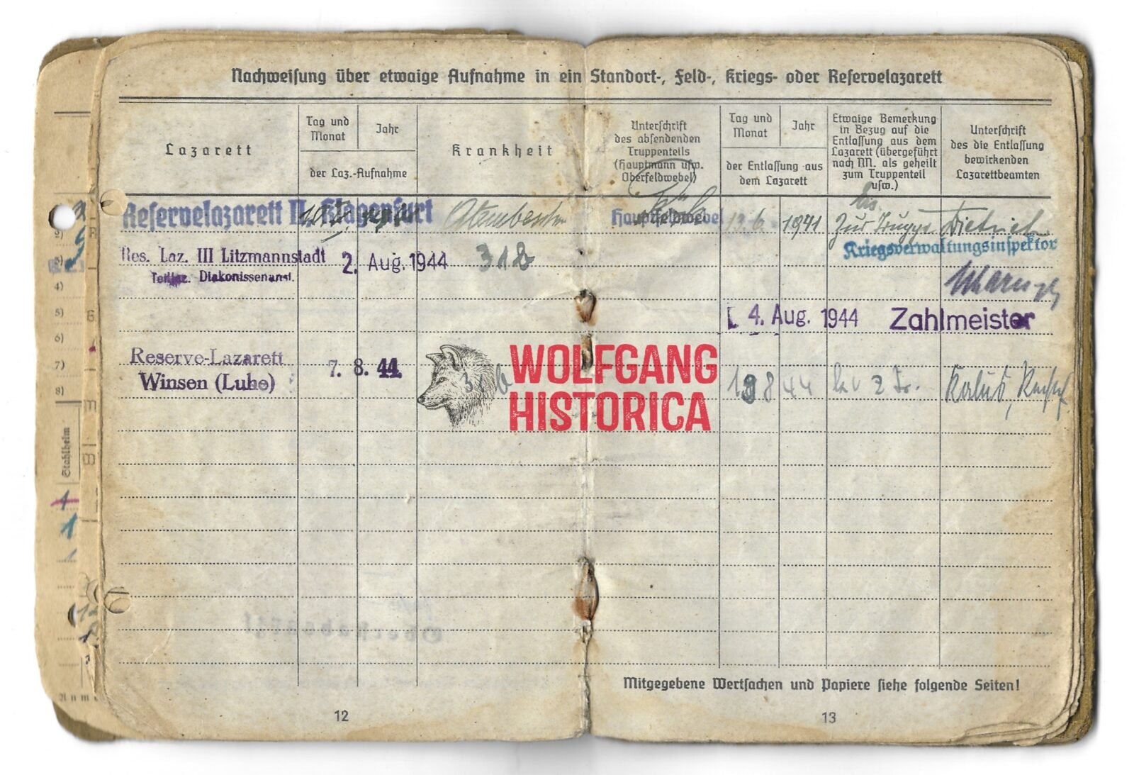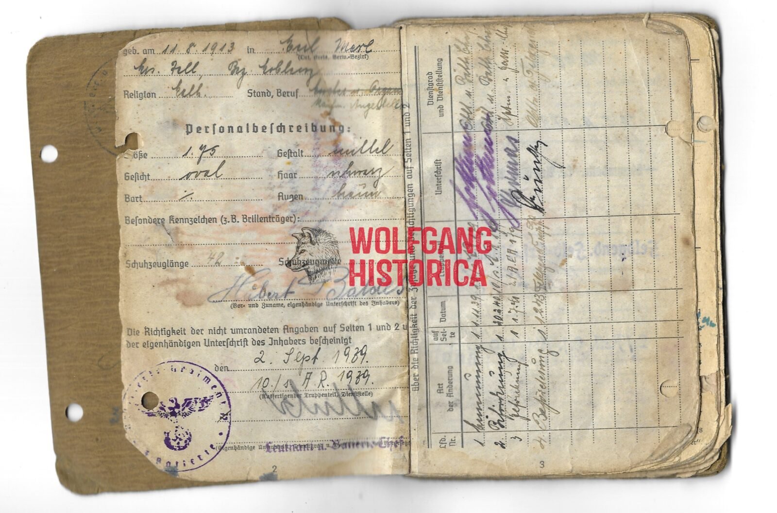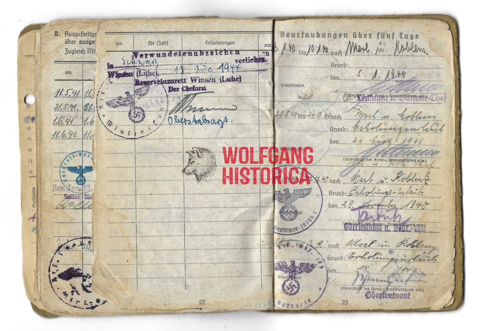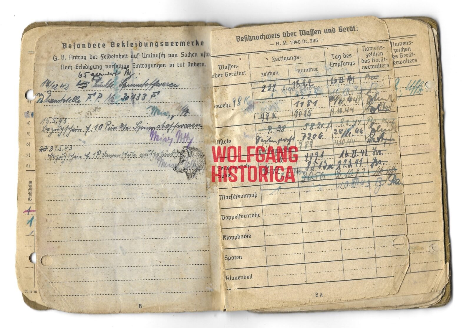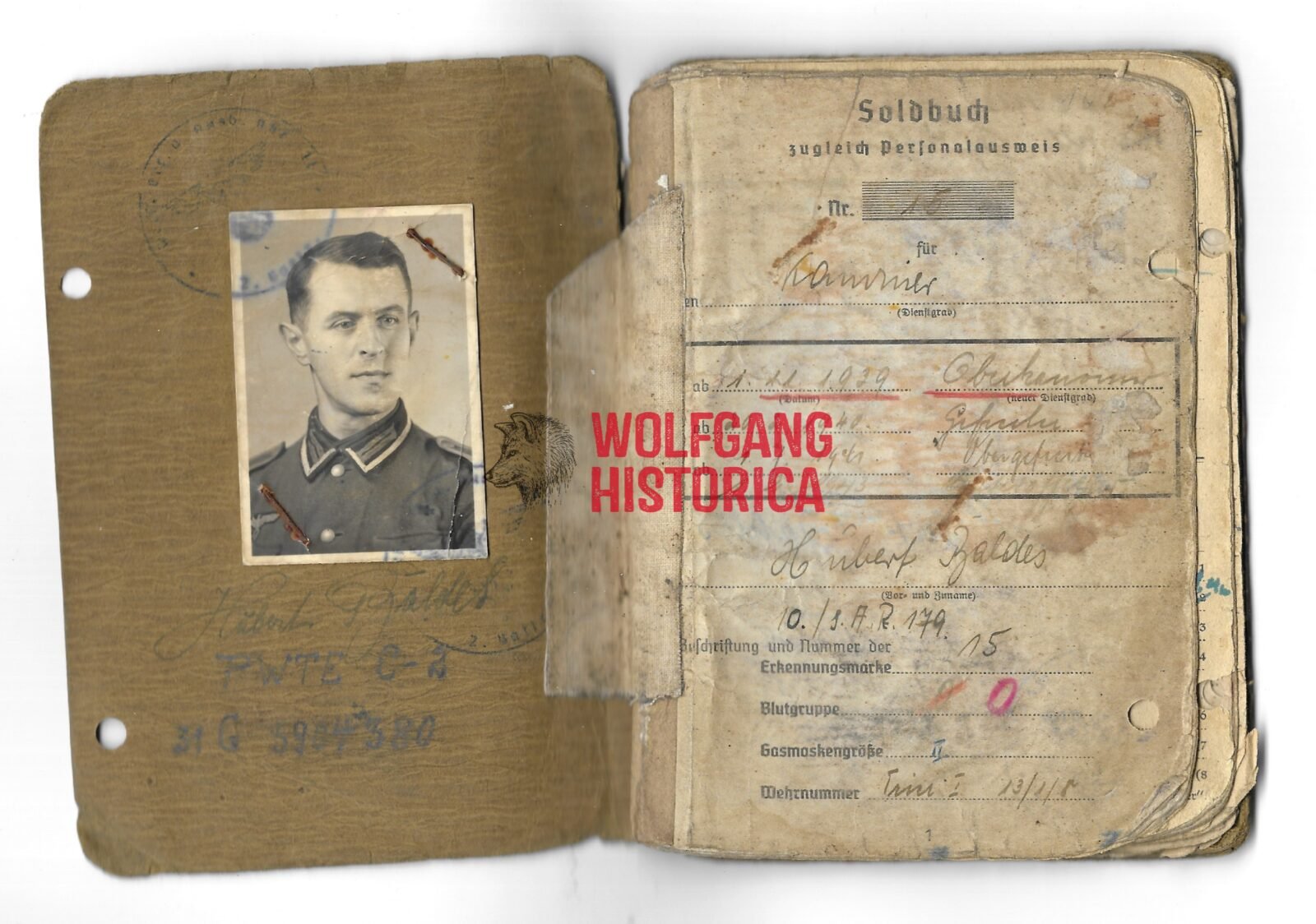 Original Soldbuch of Obergefreiter Baldes, who served with the 5. Batterie & 10. Batterie/ Artillerie-Regiment 179, Feldgendarmerie-Ersatz-Kompanie 5, Feldgendarmerie-Trupp 590, 7. Batterie/ Artillerie-Regiment 292 and the 7. Batterie/ Artillerie-Regiment 147 of the 47. Volksgrenadier-Division. With the latter, he most certainly saw action on the Western front. Either end of July of begin of August 1944, he was wounded by Shrapnel, for this wound he was awarded the Verwundetenabzeichen in Schwarz on August 18, 1944. Complete with photo.
