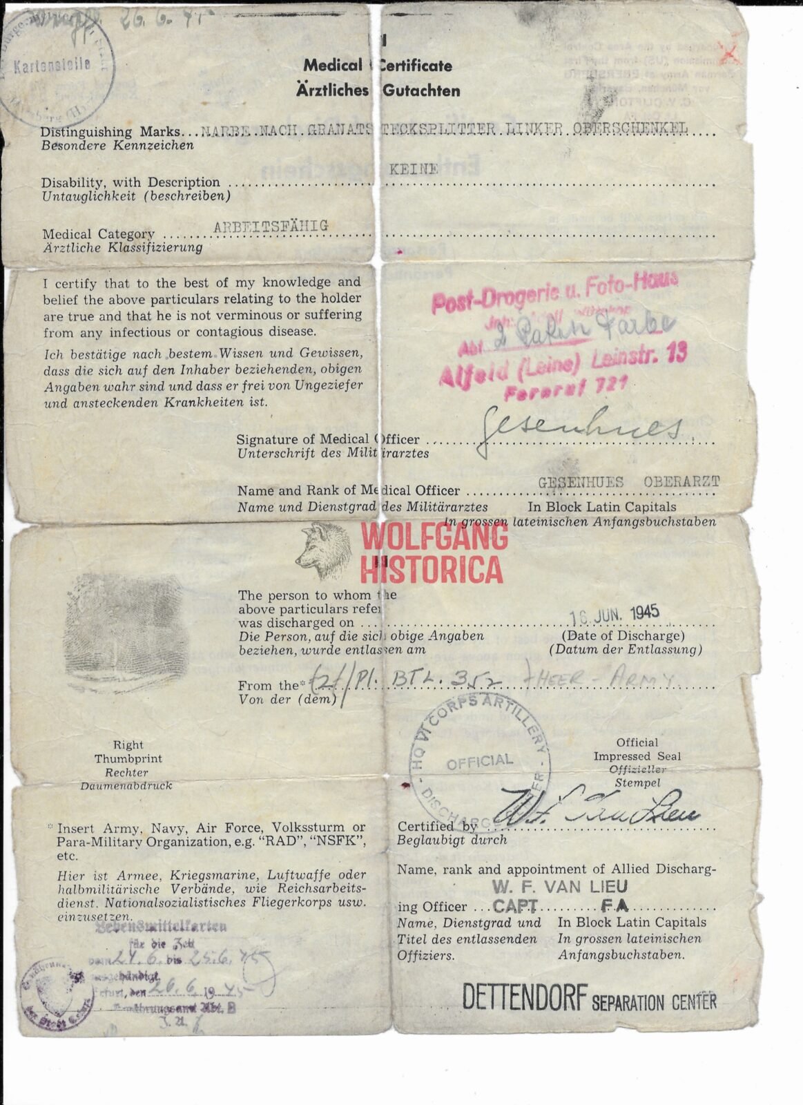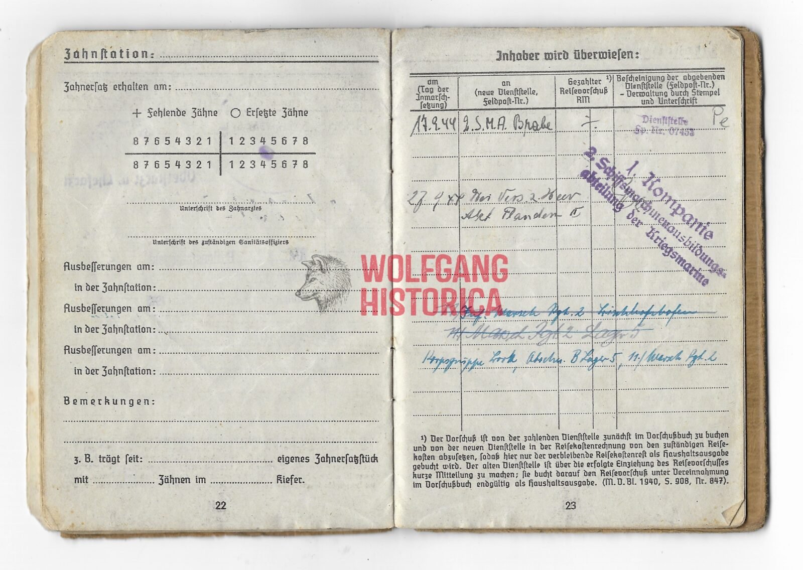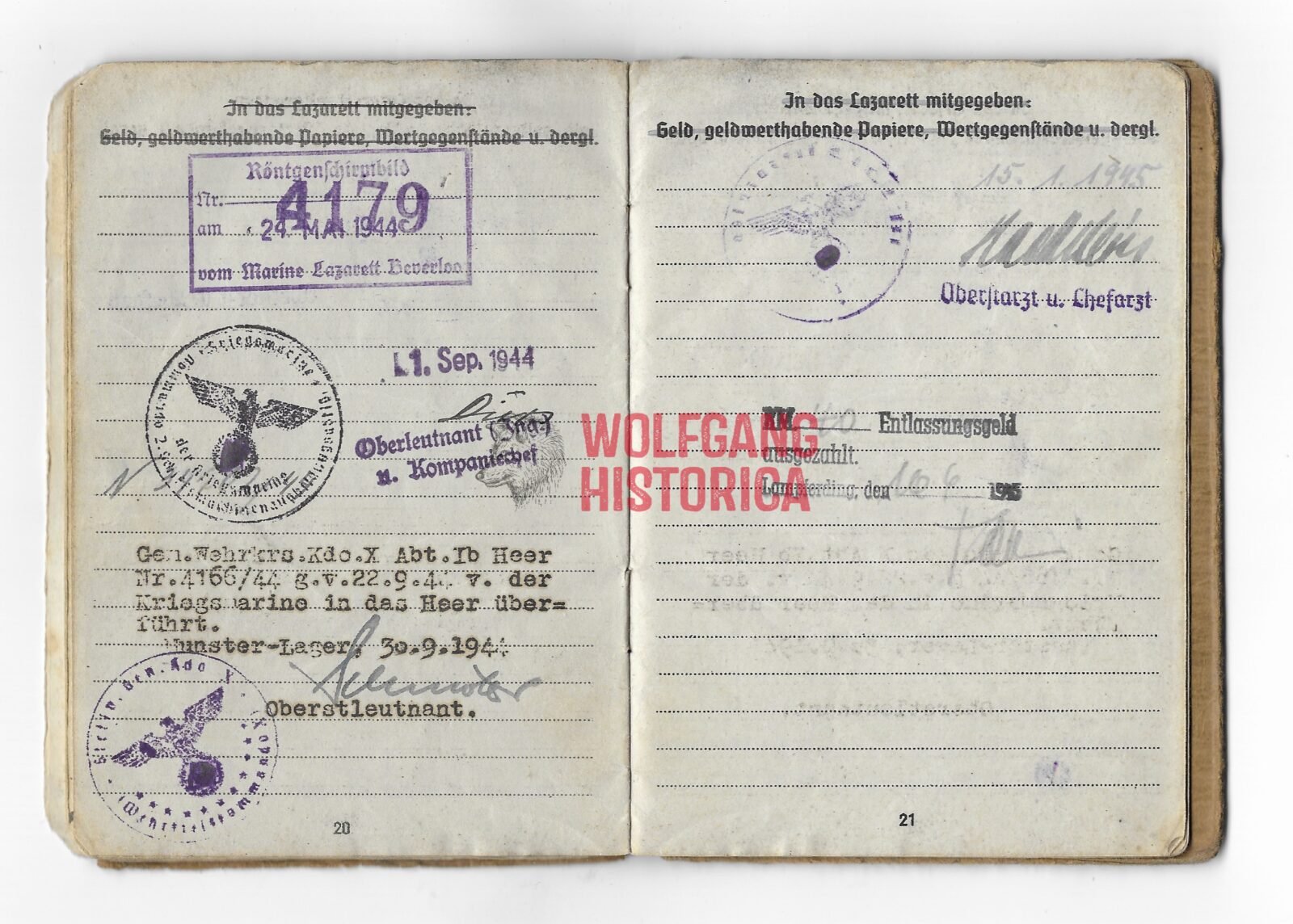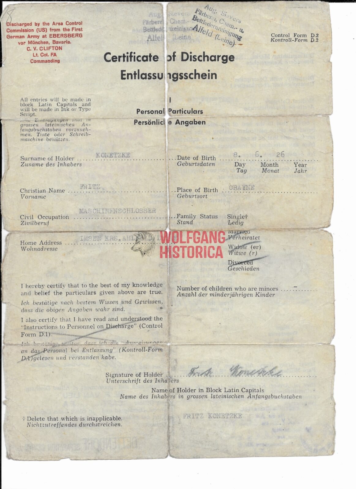 Original Set of a Soldbuch, Award document and POW Certificate-of-Discharge for Pionier Konetzke who first served with the Kriegsmarine but was transferred to the Wehrmacht in September 1944. He then served with the 2. Kompanie/ Pionier-Bataillon 352 of the 352. Infanterie-Division / 352. Volksgrenadier-Division. This division was active in Normandy at Omaha beach! He was wounded on the first day of the Ardennes Offensive on December 16, 1944. At 16 December, they fought in the area of Ettelbrück – Diekirch. Soldbuch & document are denazified otherwise good condition.