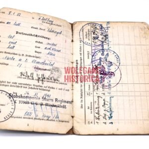 Original Grouping of Oberjäger Rudolf Juhlemann, born on January 9, 1922 in Floßberg and was a Bäckergehilfe as profession. The Soldbuch was opened on June 24, 1941 by the Stabskompanie/ Sturm-Regiment. He wore the Erkennungsmarke: 6312/4781. He was a Captured on September 3, 1944 at Mons (Bergen, Belgium) in the “Kessel of Mons”.