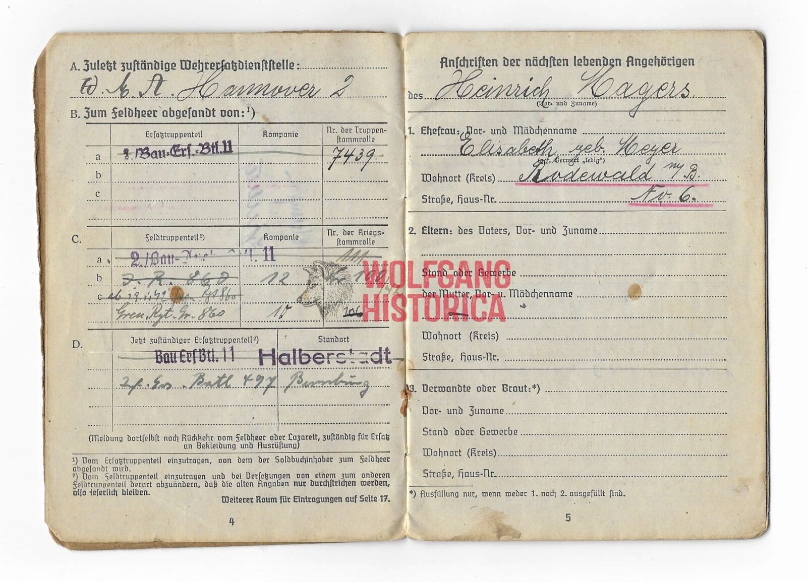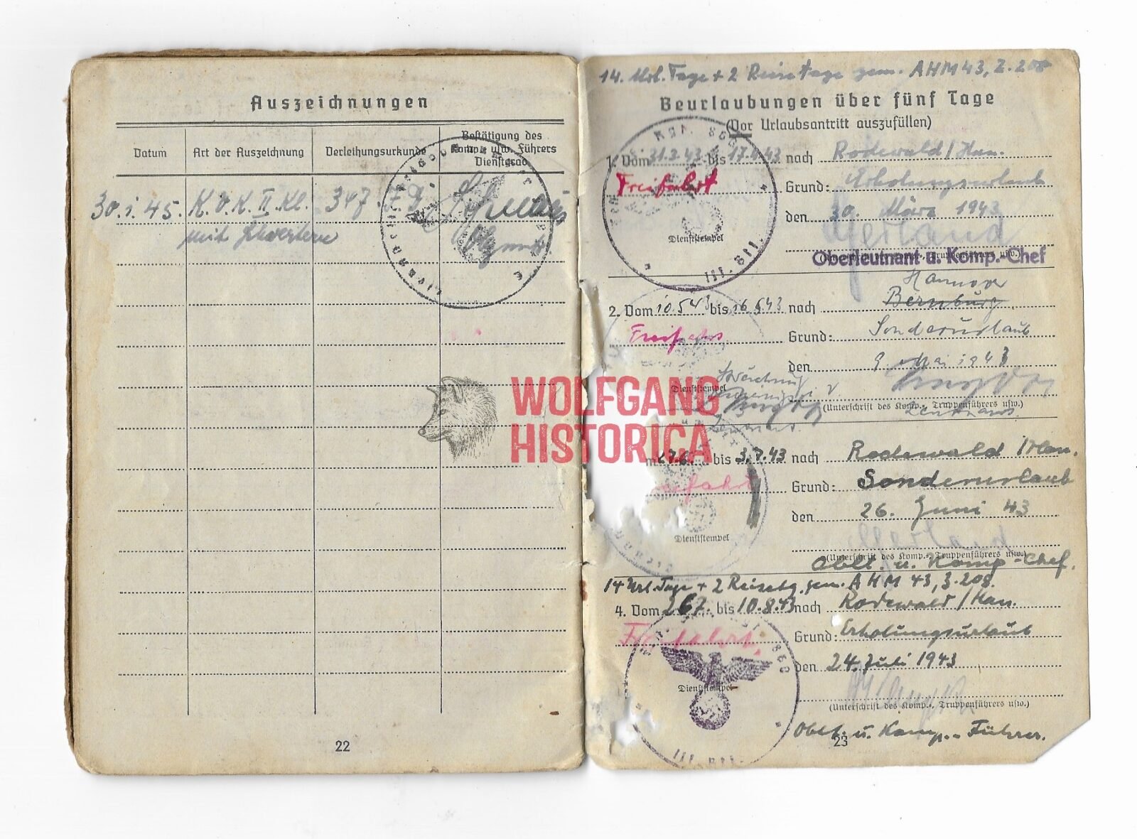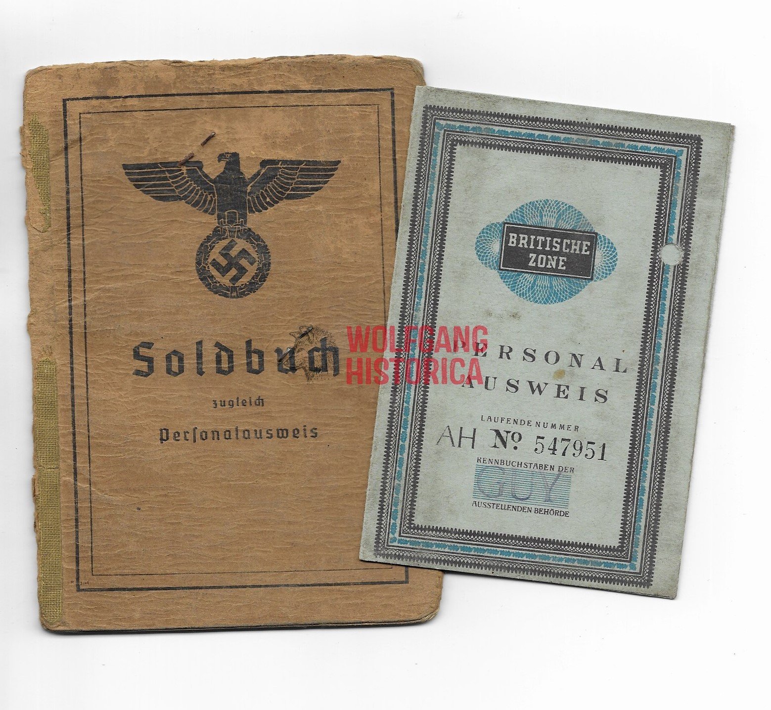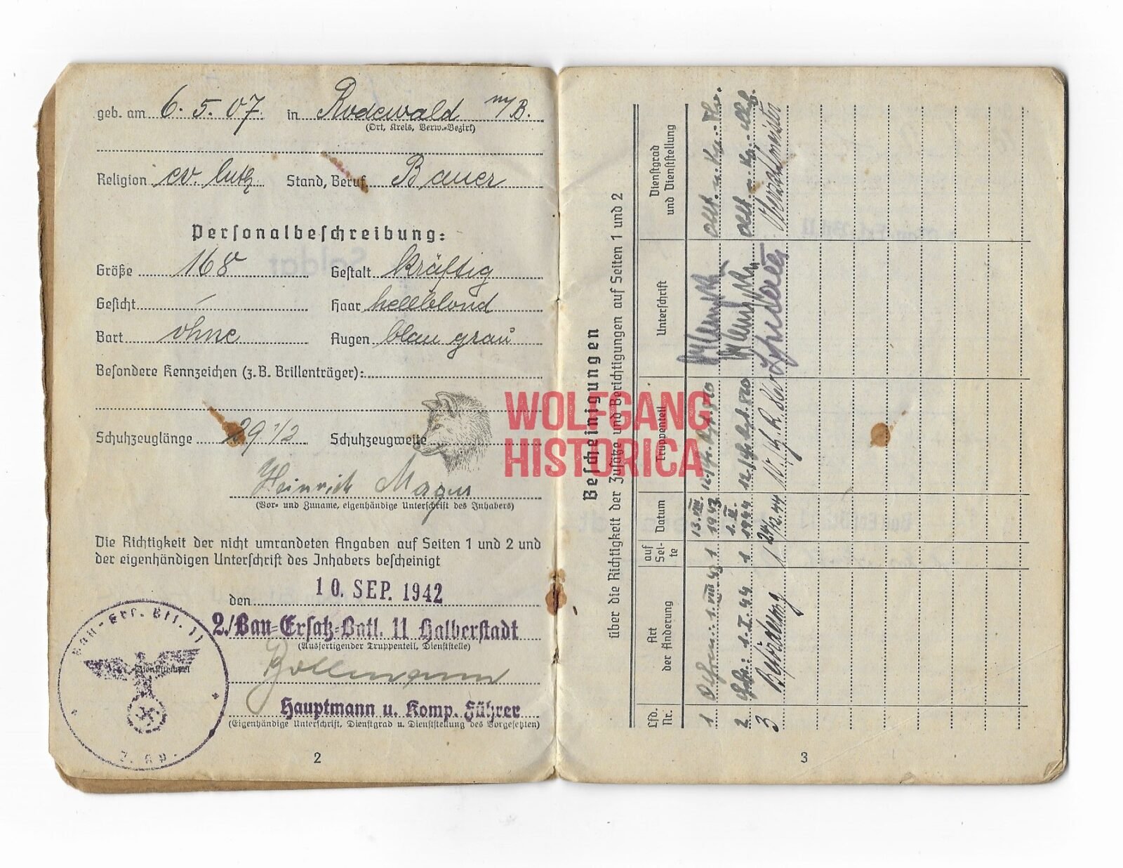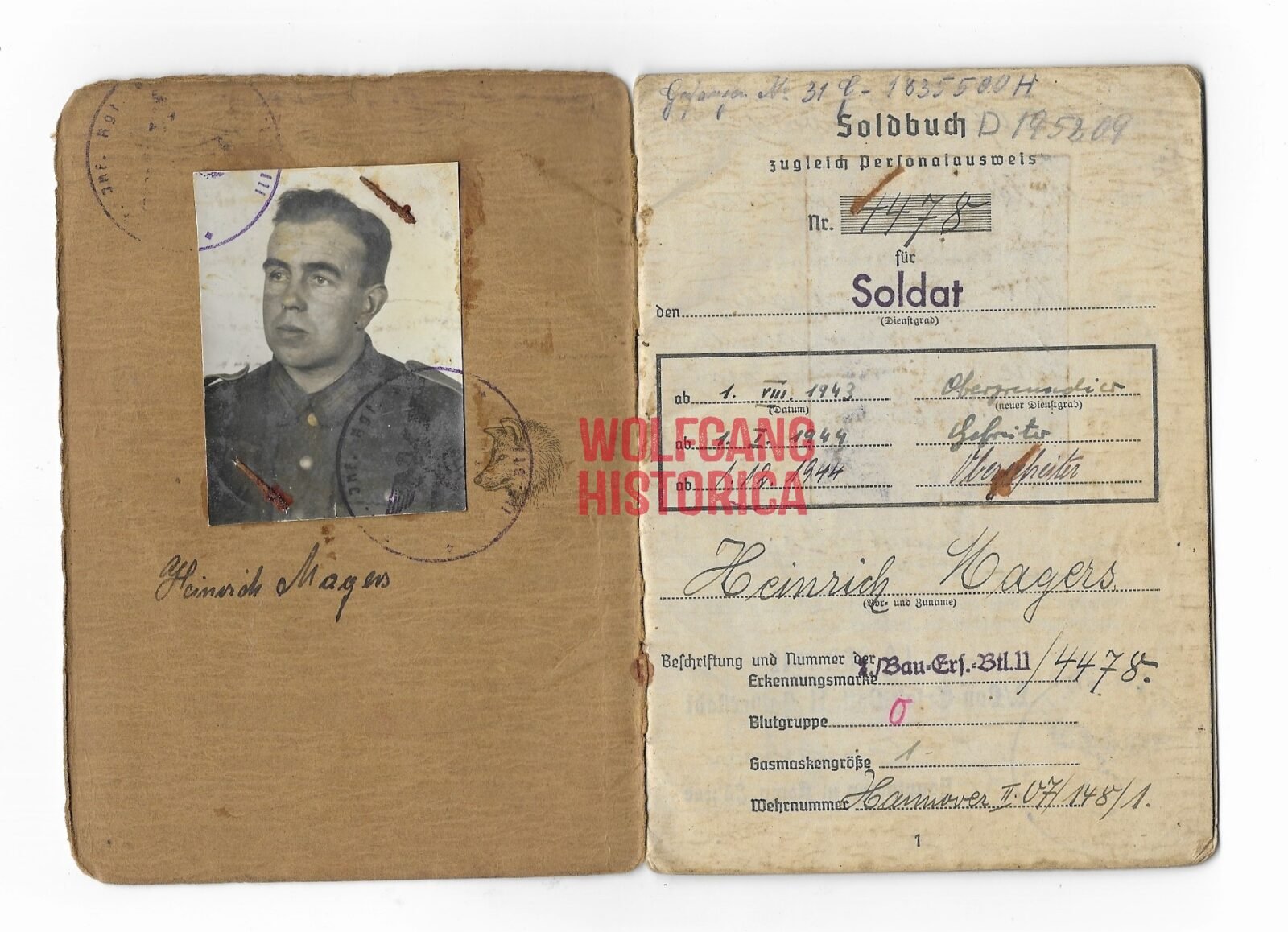 Soldbuch of Obergefreiter Heinrich Magers. He served with the Festungs-Infanterie-Regiment 860 & Grenadier-Regiment 860 of the 347. Infanterie-Division. He earned the Kriegsverdienstkreuz 2. Klasse mit Schwertern on January 30, 1945. Uncommon unit! Served in Holland, Belgium, Saar etc. Complete except for the backcover missing, with photo. Comes with British ID.