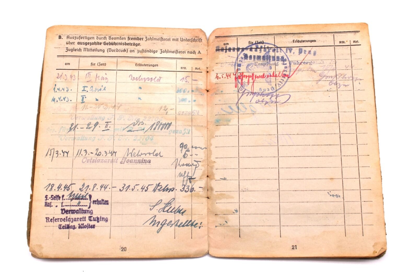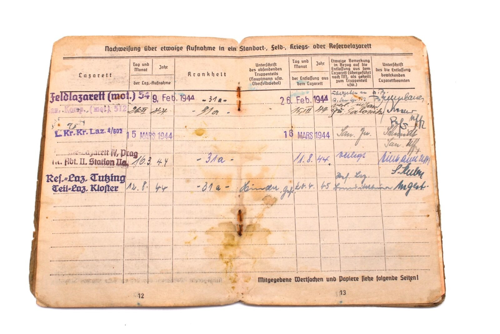 - On (or close to) 09.02.1944 he suffered a (severe) Gunshot wound (Wound Code 31b) and was treated at Feldlazarett 54 here until February 26, 1944, when he was sent to another medical unit, Sanitäts-Kompanie (mot) 512, – in Saloniki, Greece – in which he stayed for almost 3 weeks. He then was transferred to the L.Kr.Kr.Laz.4/602 – in Ioannina, Greece – which put him on a transport to Reserve-Lazarett IV, Prag on March 16, 1944. Here he was treated for just less than 5 months, before he was transferred to the Reserve-Lazarett Tutzing, Teil-Lazarett Kloster. Here he spent the remaining period of the war until April 20, 1945 before being sent again to another hospital.Â