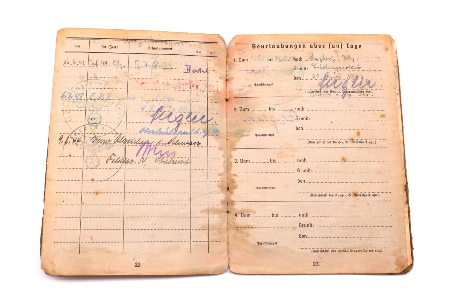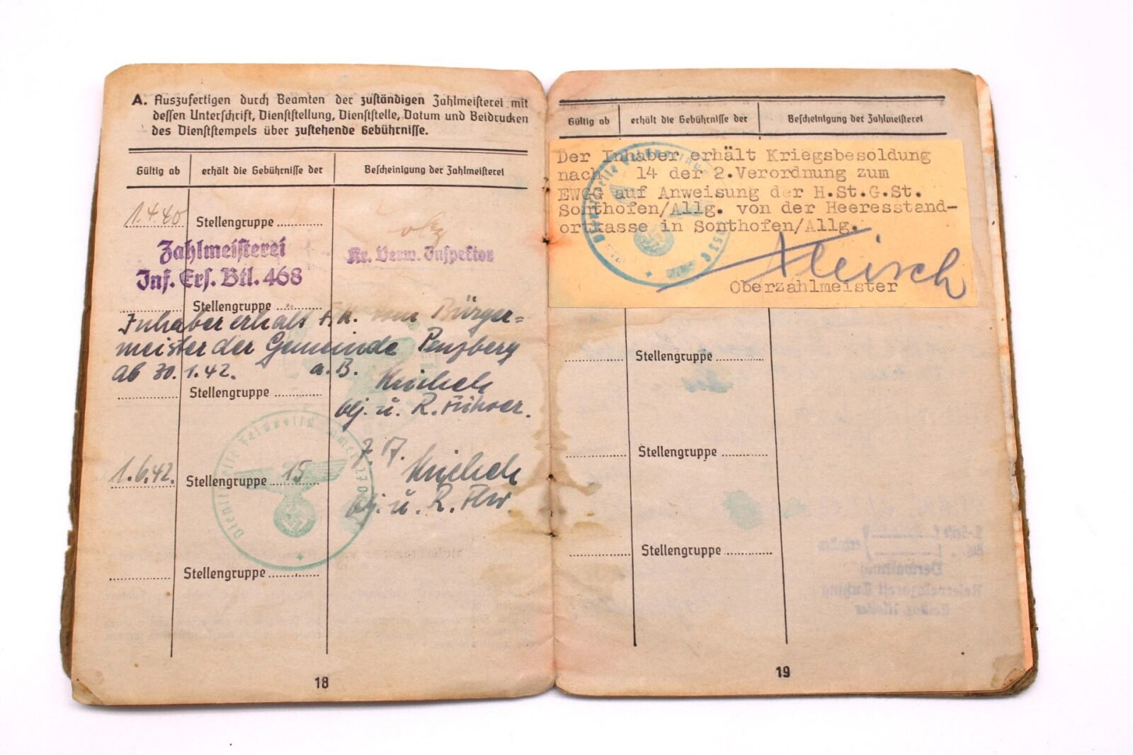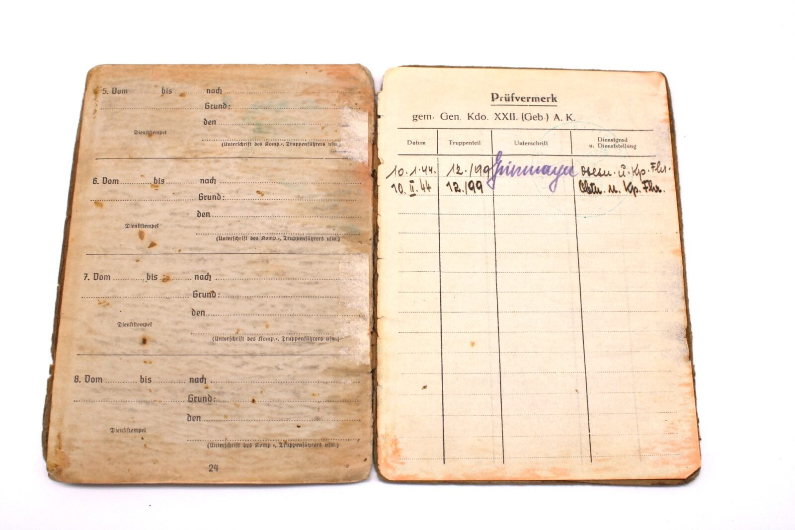 - Page 15 & Prüfvermerk page: Second security entry signed by Oberleutnant und Kompanieführer Hans Griesmayer (EBS). He was Killed in Action on October 18, 1944.