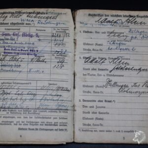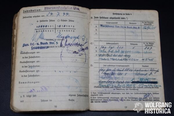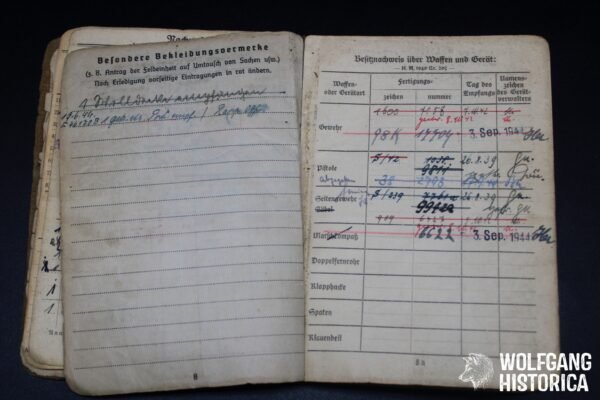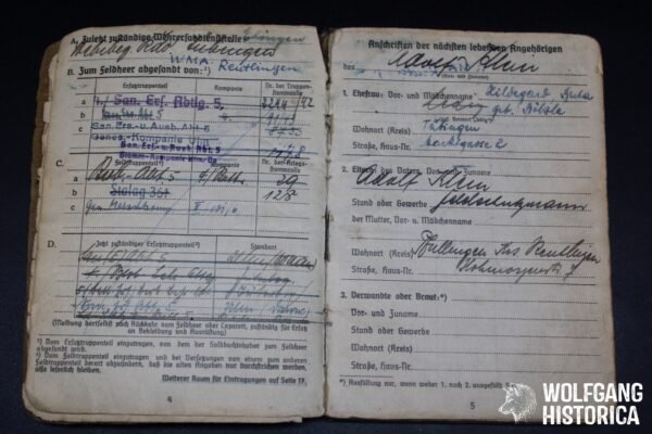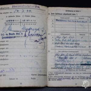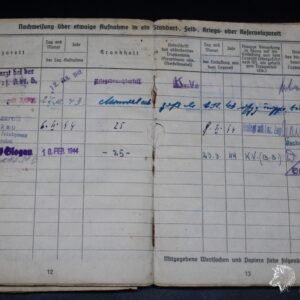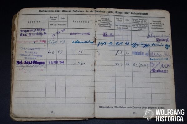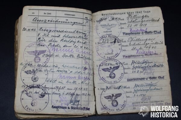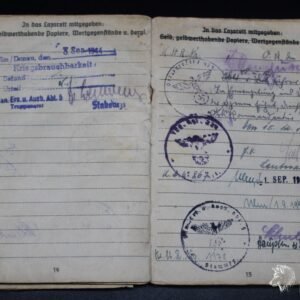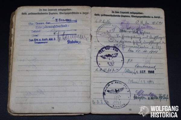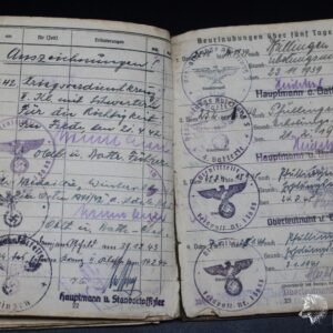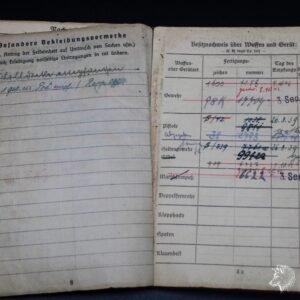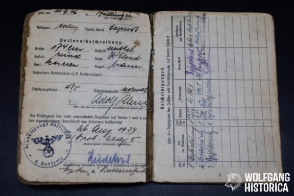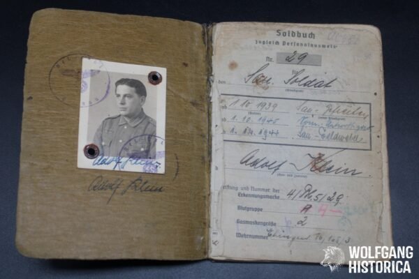 Original Soldbuch of Sanitäts-Feldwebel Klein who served with the Beobachtungs-Abteilung 5, Stalag 361, Jäger-Regiment 229, Heeres-Festungs-Artillerie-Abteilung 1305, 1509 and 1524. He earned the Kriegsverdienstkreuz 2. Klasse mit Schwertern, Winterschlacht im Osten, Demjanskschild and Eisernes Kreuz 2. Klasse. Complete with photo. Condition as seen.