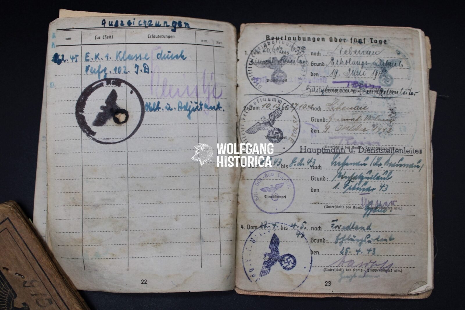 Original Soldbuch of Oberleutnant Arno Ringel, who served with the Landesschützen-Bataillon 554. Feldkommandantur 1013. Regimentsgruppe 348 and Grenadier-Regiment 216. The Grenadier-Regiment 216 was part of the 102. Infanterie-Division. He was decorated with the Kriegsverdienstkreuz 2. Klasse, Verwundetenabzeichen in Schwarz, Eisernes Kreuz 2. Klasse and in 1945 the Eisernes Kreuz 1. Klasse! He was wounded in February 1945 so most likely in fighting in Germany.